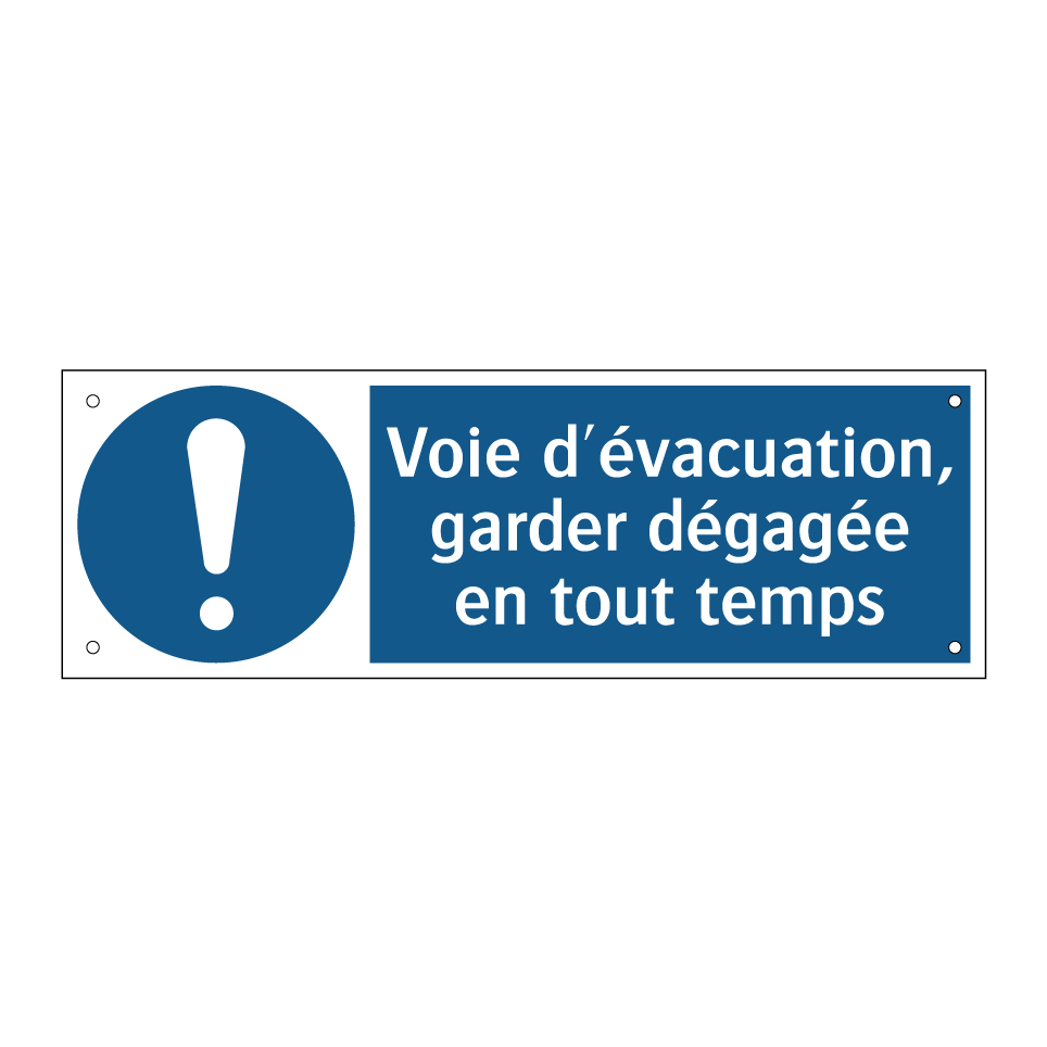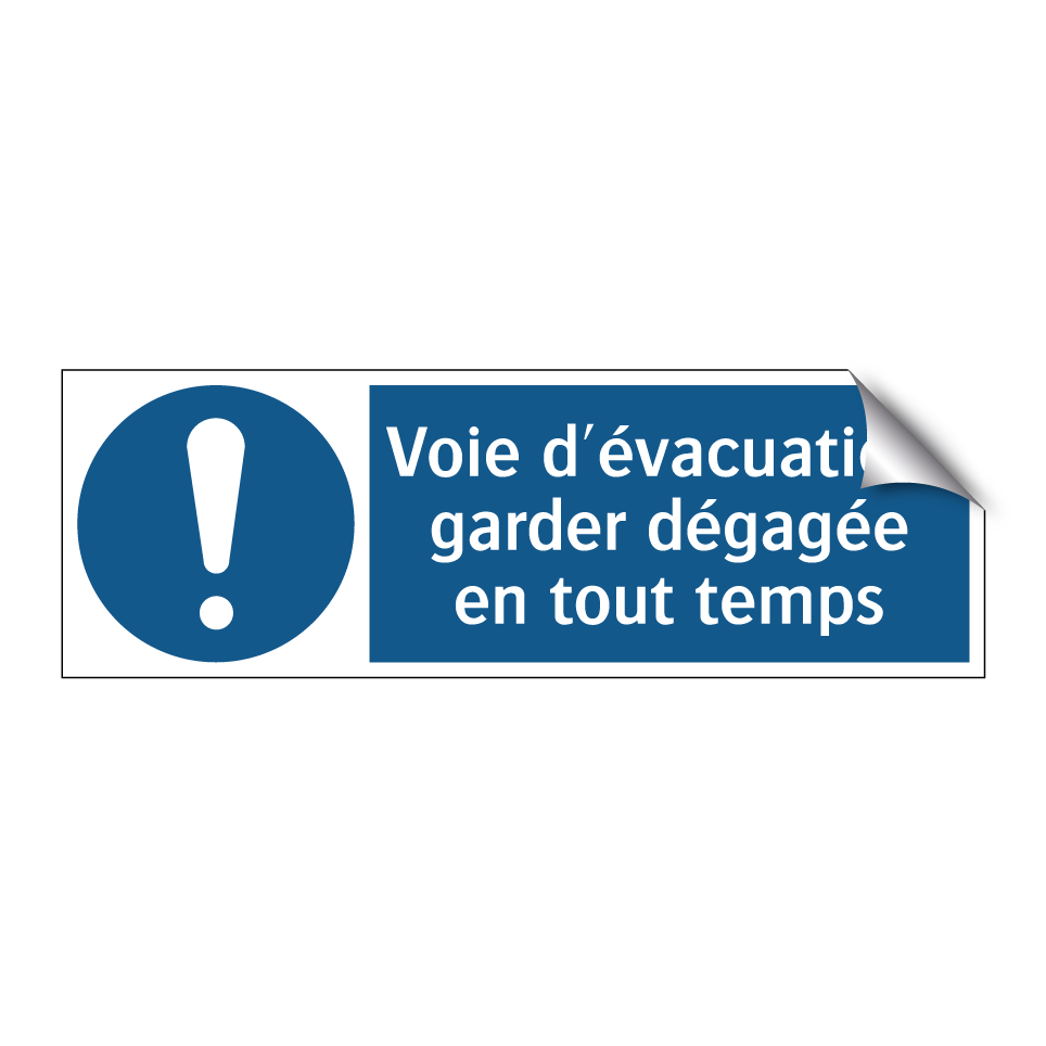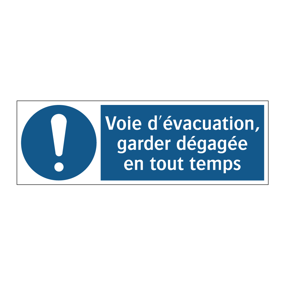Panneau d'obligation avec le texte : "Voie d'évacuation, garder dégagée en tout temps"