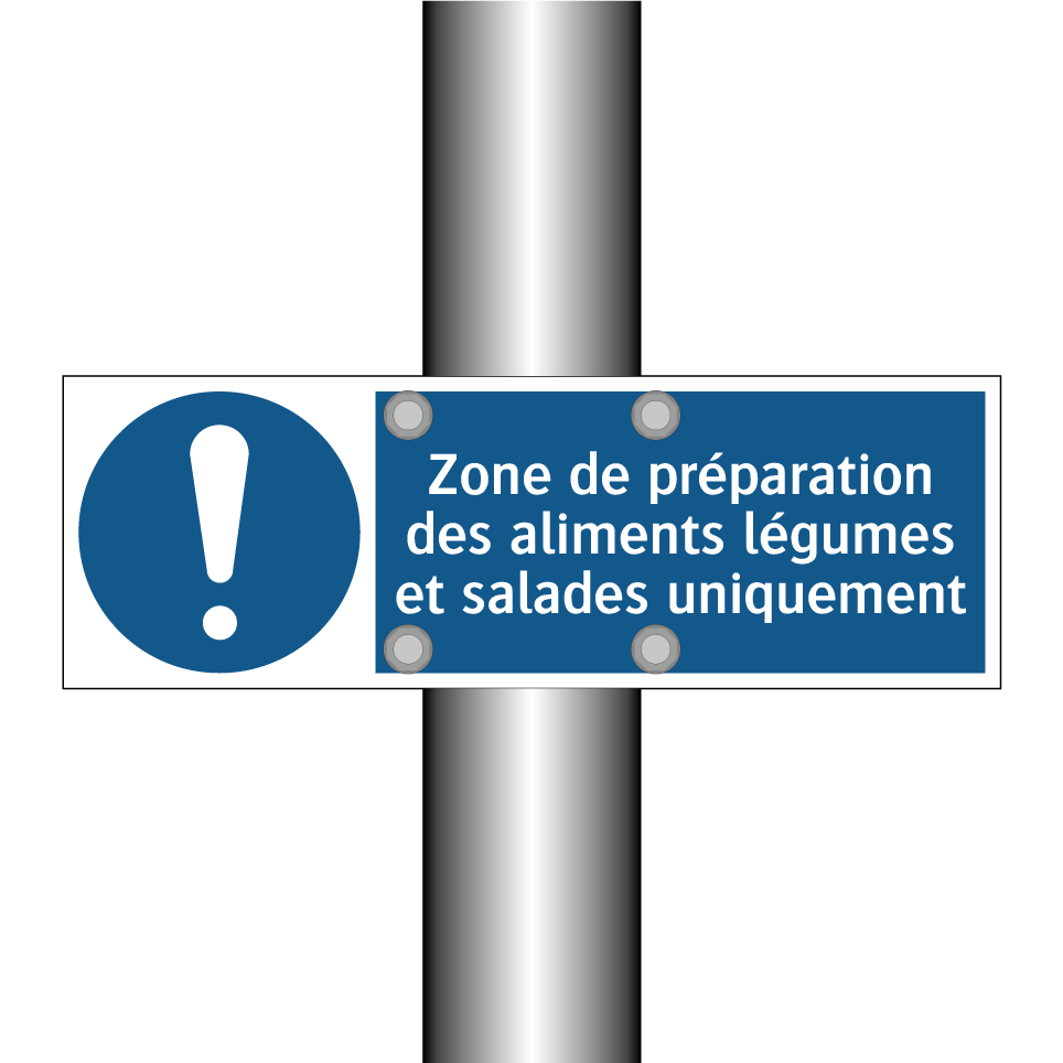 Panneau d'obligation avec le texte : "Zone de préparation des aliments légumes et salades uniquement"