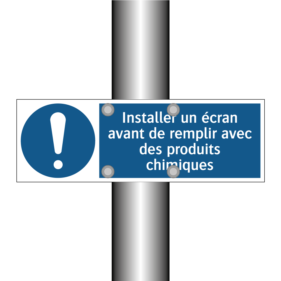 Panneau d'obligation avec le texte : "Installer un écran avant de remplir avec des produits chimiques"