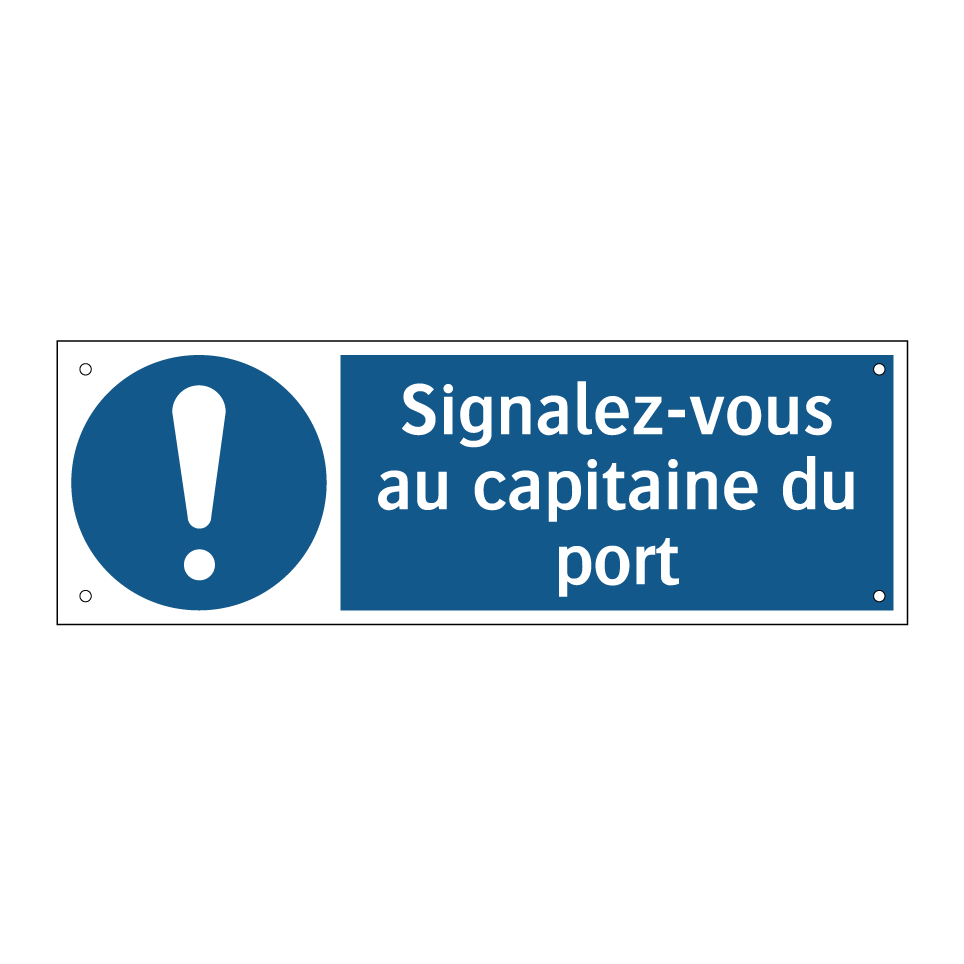 Panneau d'obligation avec le texte : "Signalez-vous au capitaine du port"