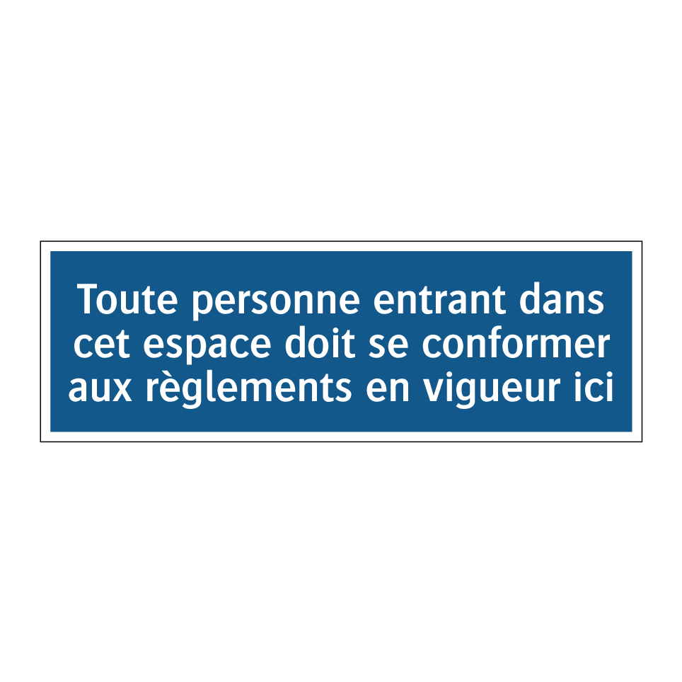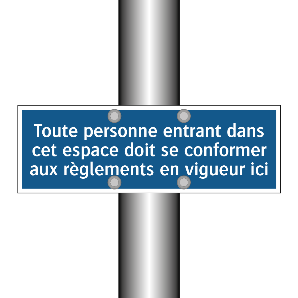 Panneau d'obligation avec le texte : "Toute personne entrant dans cet espace doit se conformer aux règlements en vigueur ici."
