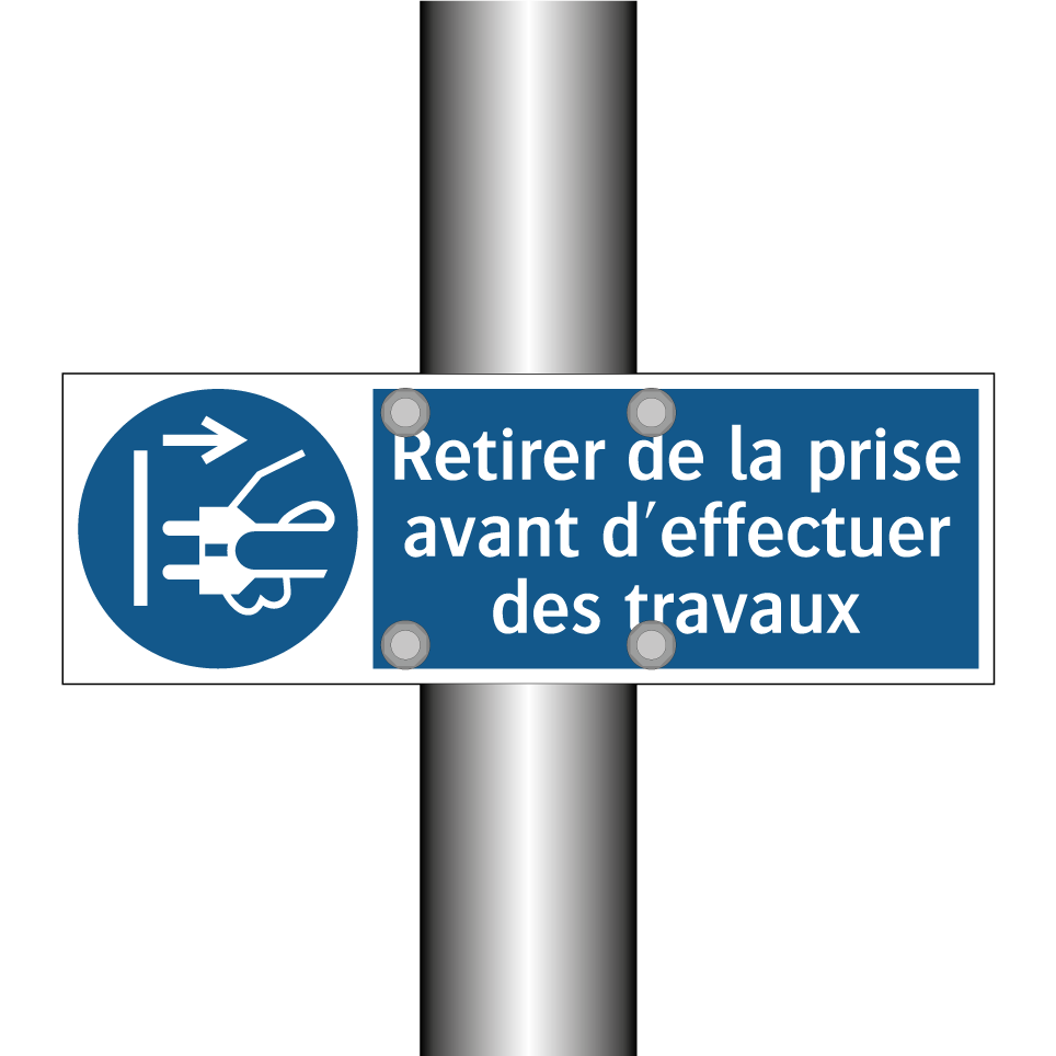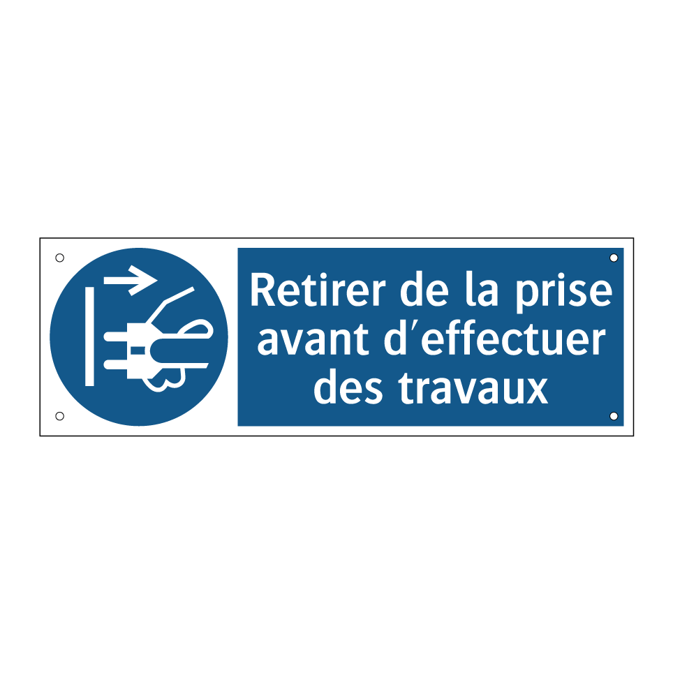 Panneau d'obligation avec le texte : "Retirer de la prise avant d'effectuer des travaux"