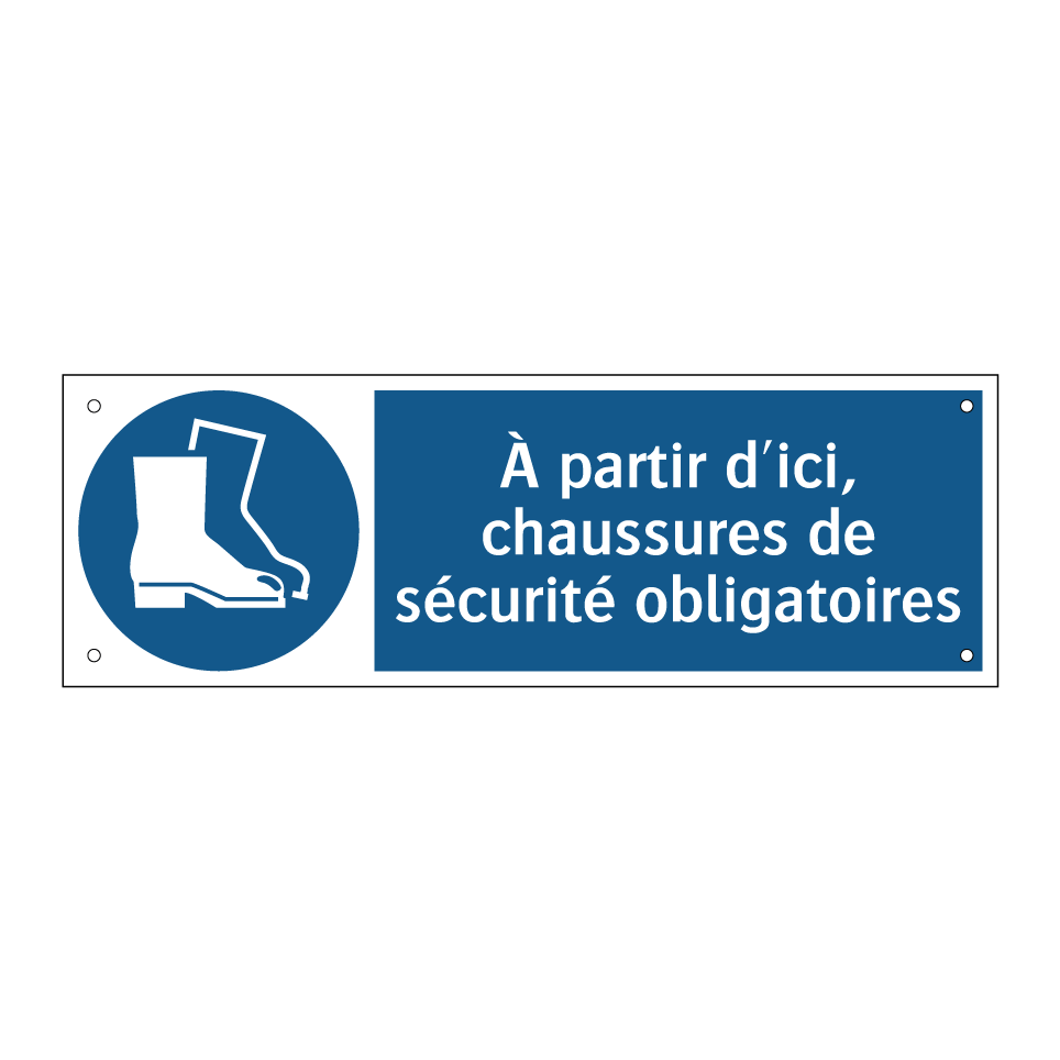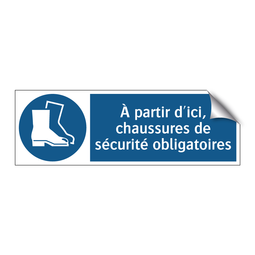 Panneau d'obligation avec le texte : "À partir d'ici, chaussures de sécurité obligatoires"