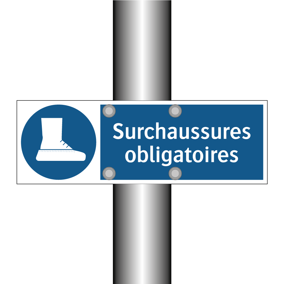 Panneau d'obligation avec le texte : "Surchaussures obligatoires"