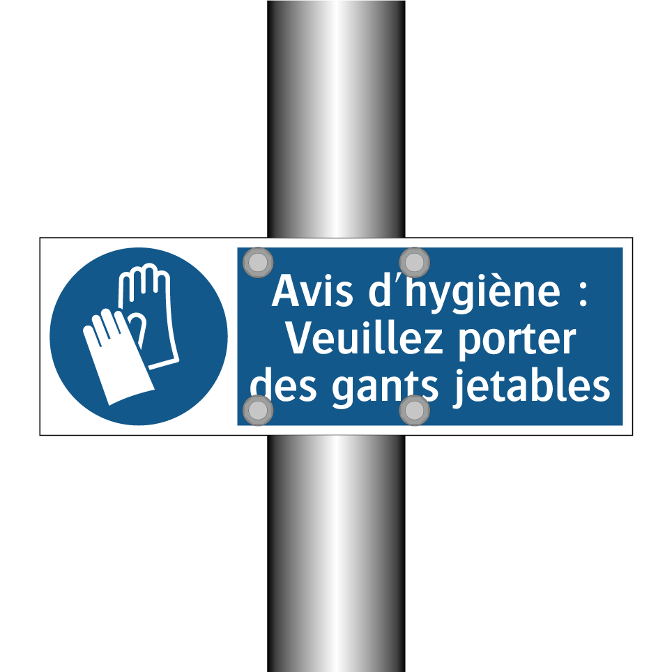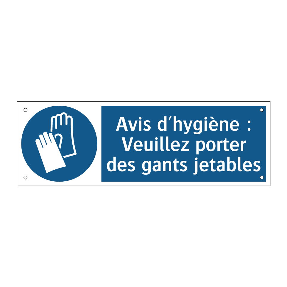 Panneau d'obligation avec le texte : "Avis d'hygiène : Veuillez porter des gants jetables"