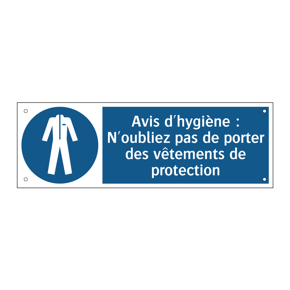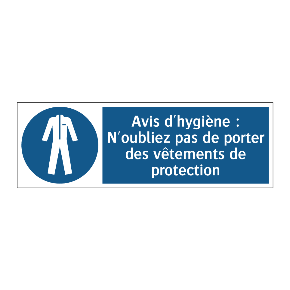 Panneau d'obligation avec le texte : "Avis d'hygiène : N'oubliez pas de porter des vêtements de protection"