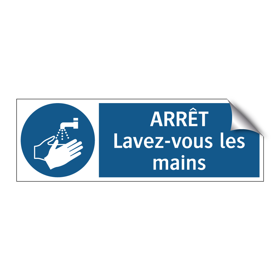 Panneau d'obligation avec le texte : "ARRÊT Lavez-vous les mains"