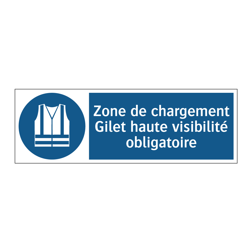 Panneau d'obligation avec le texte : "Zone de chargement Gilet haute visibilité obligatoire"