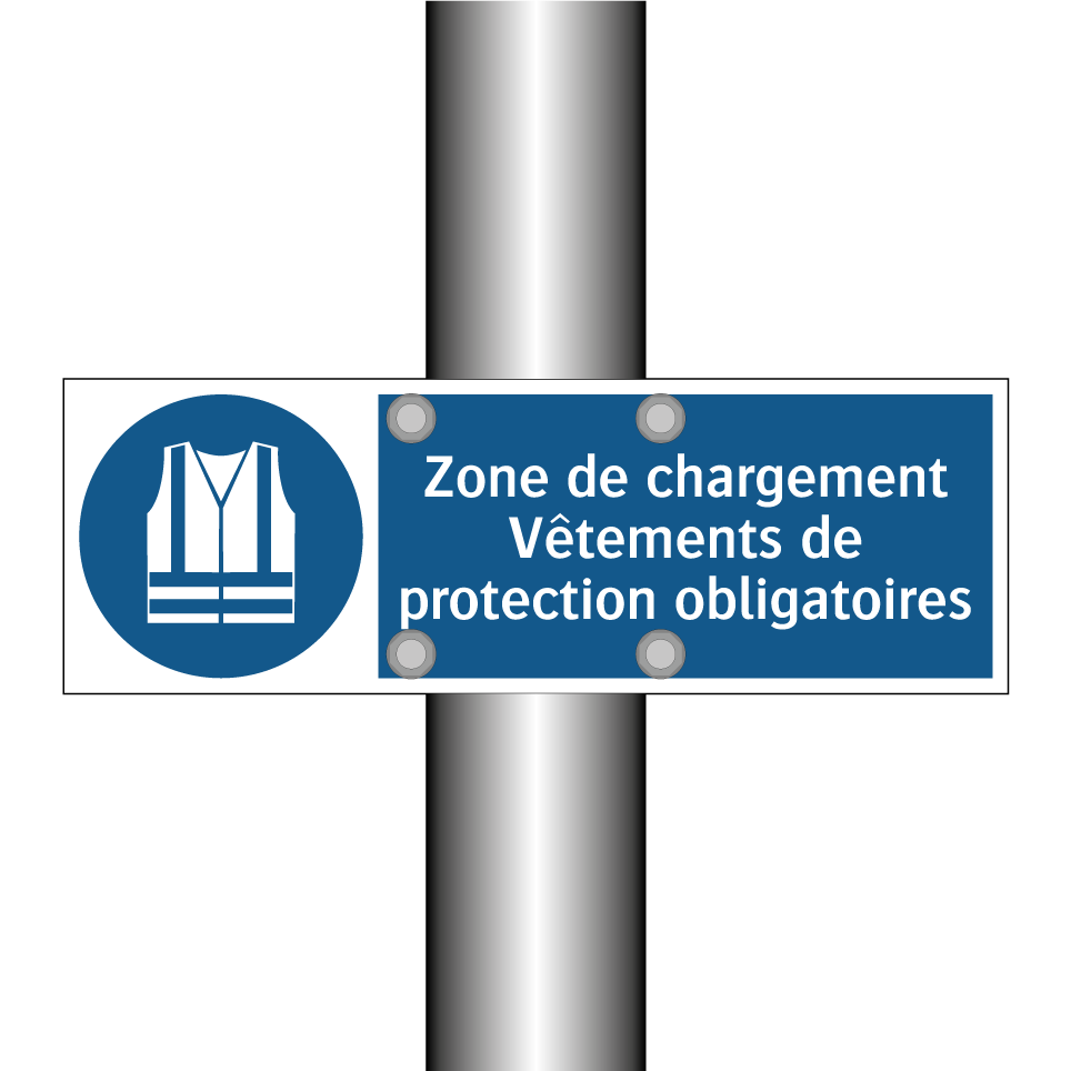 Panneau d'obligation avec le texte : "Zone de chargement Vêtements de protection obligatoires"