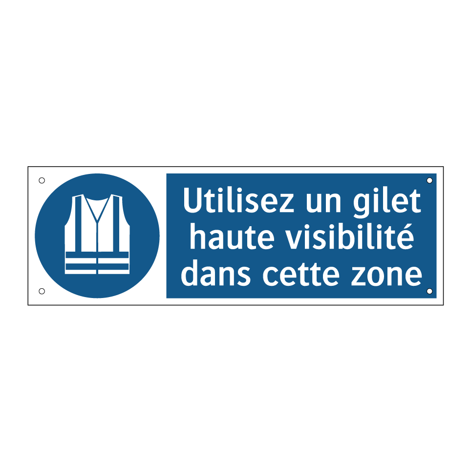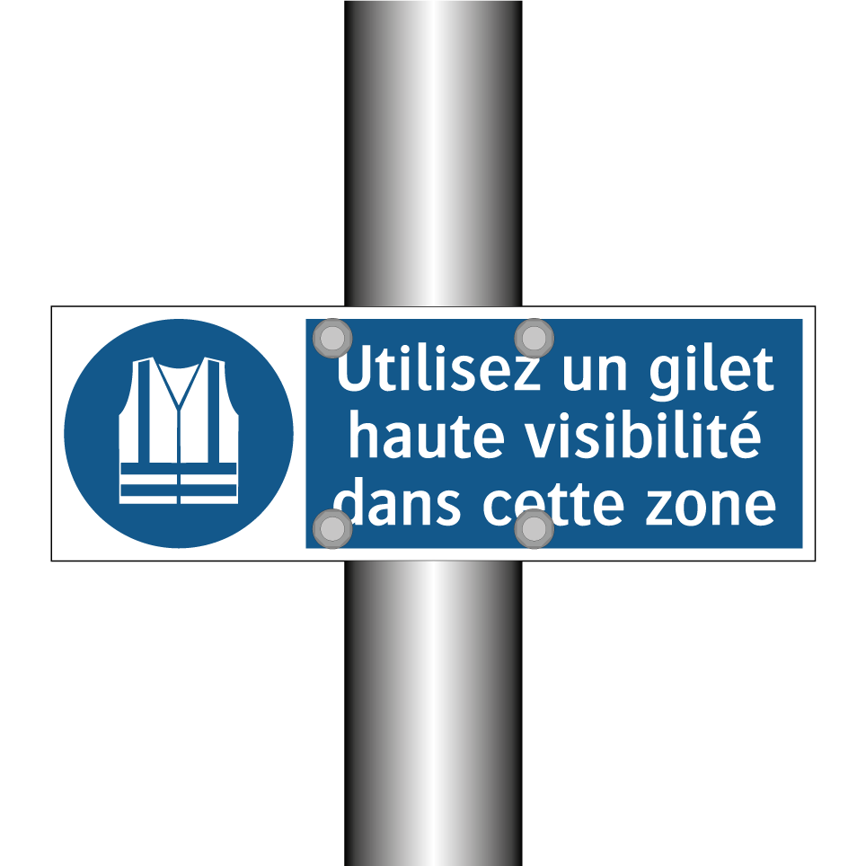 Panneau d'obligation avec le texte : "Utilisez un gilet haute visibilité dans cette zone"