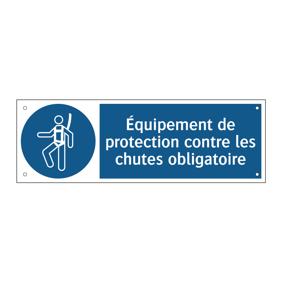 Panneau d'obligation avec le texte : "Équipement de protection contre les chutes obligatoire"