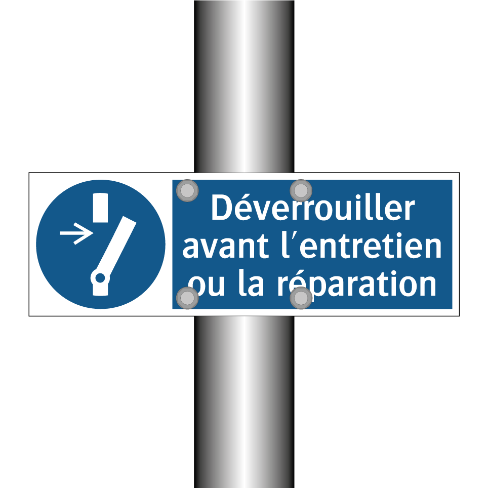 Panneau d'obligation avec le texte : "Déverrouiller avant l'entretien ou la réparation"