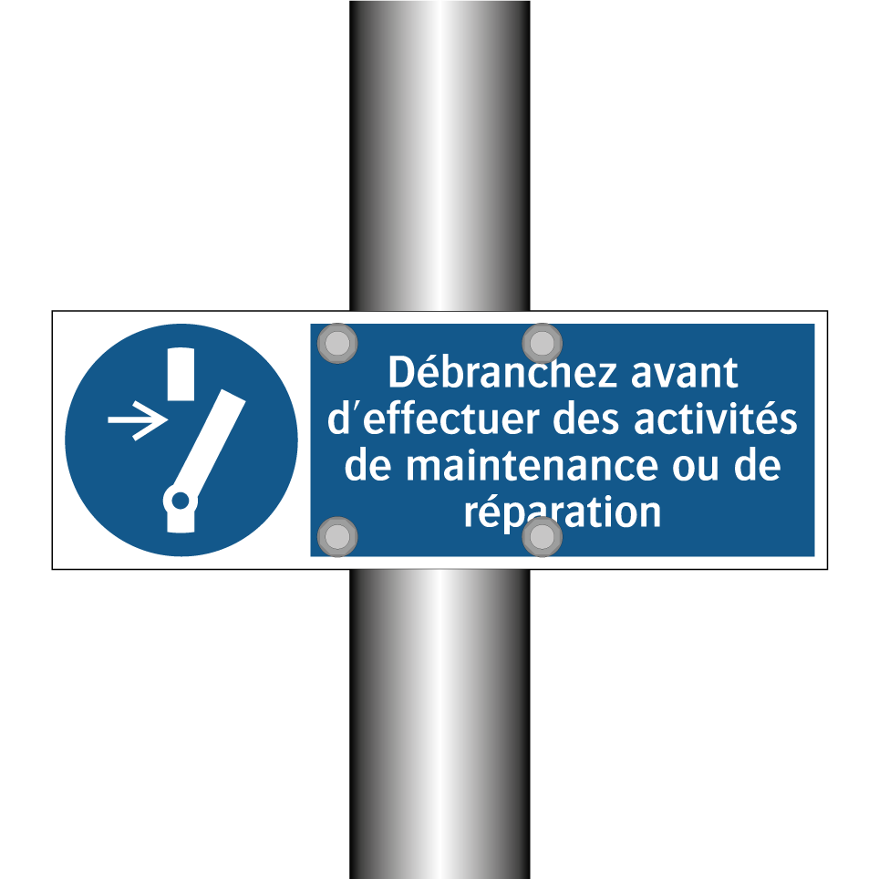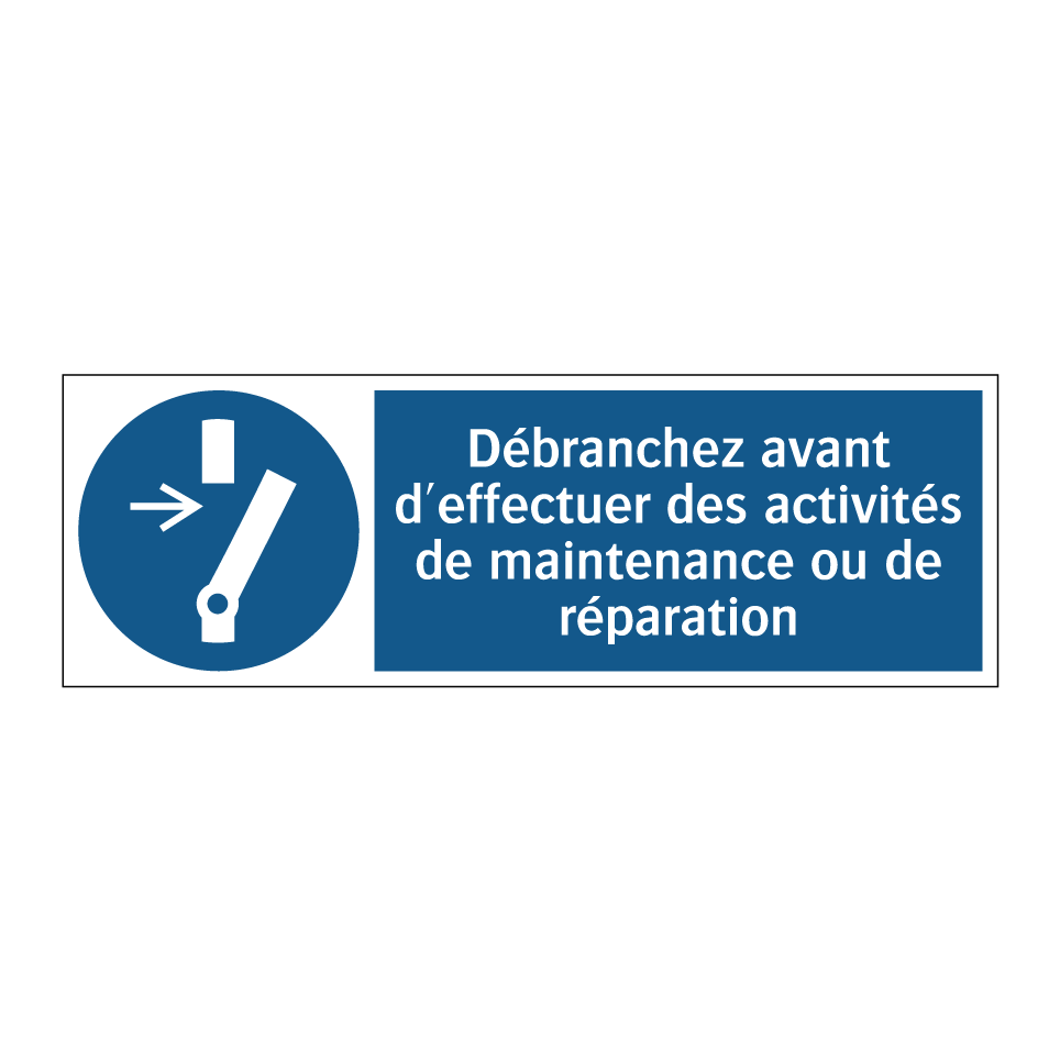 Panneau d'obligation avec le texte : "Débranchez avant d'effectuer des activités de maintenance ou de réparation"