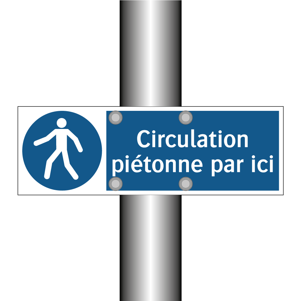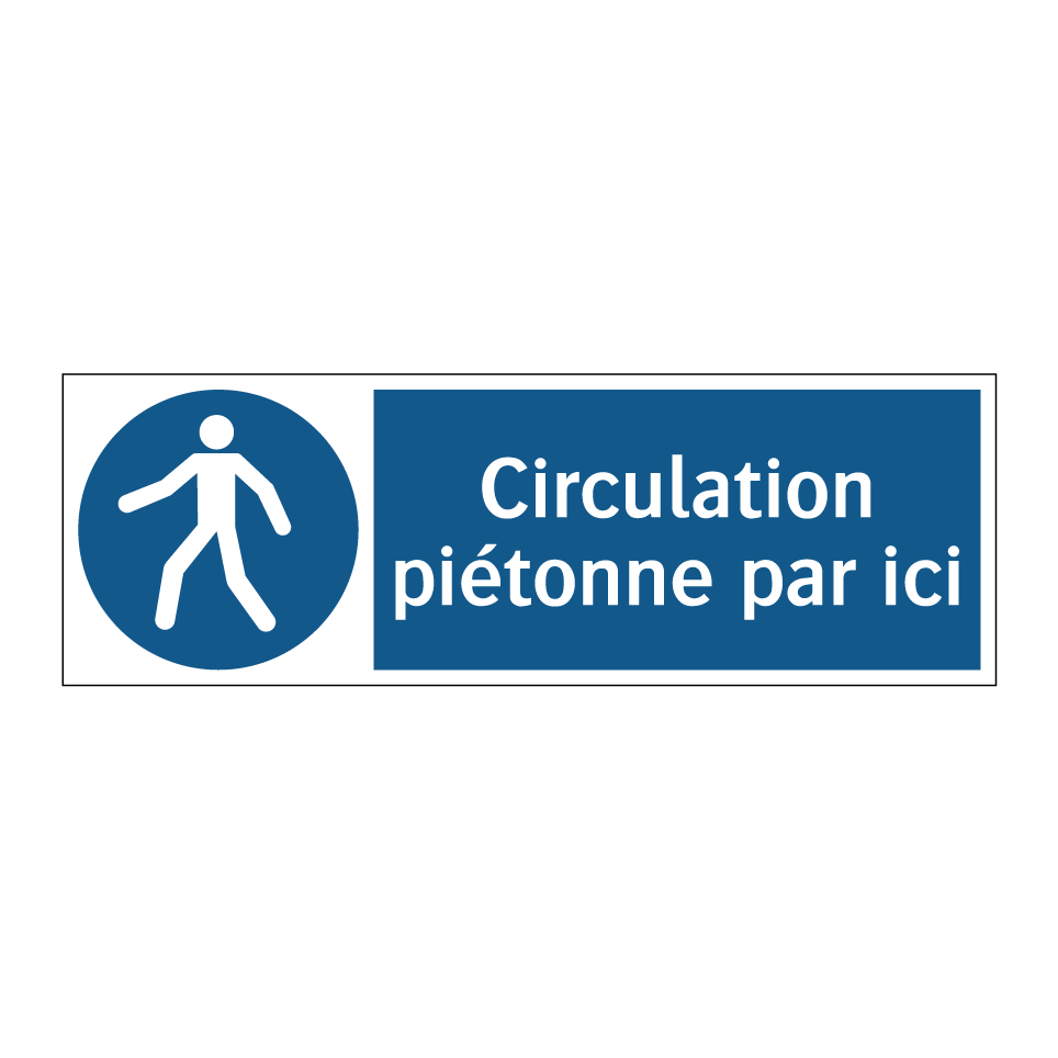 Panneau d'obligation avec le texte : "Circulation piétonne par ici"