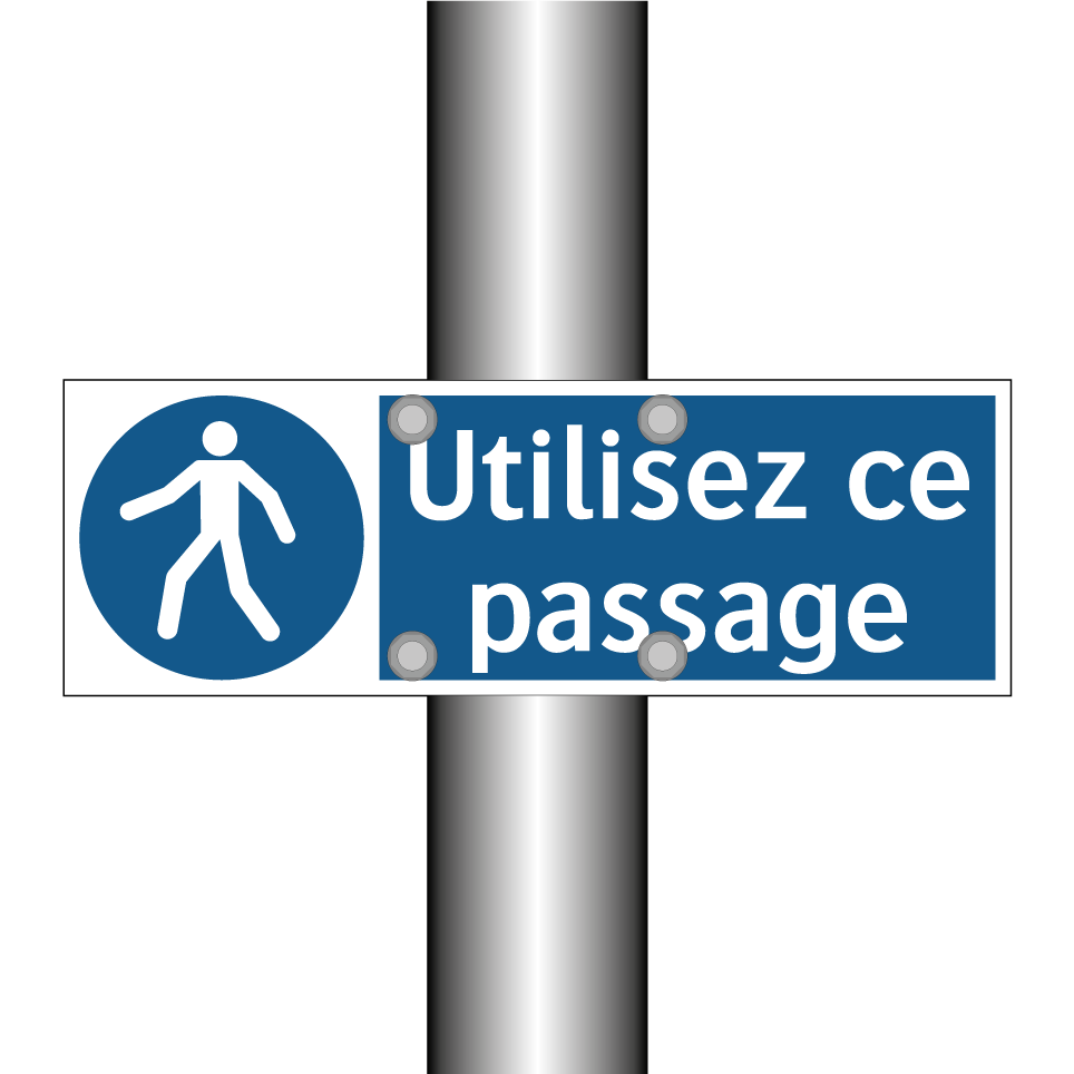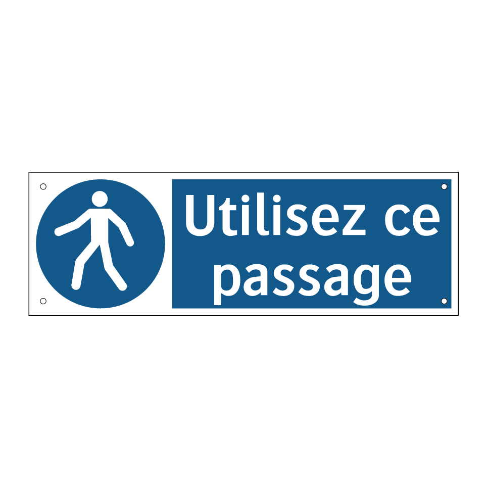 Ce panneau d'obligation est essentiel pour guider les piétons vers le passage approprié. Idéal pour les zones à fort trafic, il assure une circulation fluide et sécurisée. Ce panneau peut être installé dans des environnements variés tels que les centres commerciaux, les gares, ou les aéroports, où il est crucial de diriger les personnes vers le bon chemin. Grâce à sa couleur bleue et son texte blanc, il est facilement repérable et attire l'attention des passants. En plaçant ce panneau à des endroits stratégiques, vous garantissez une meilleure organisation des flux de personnes et une sécurité accrue.