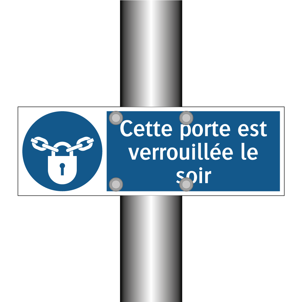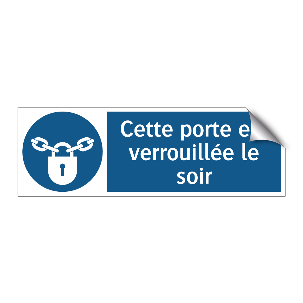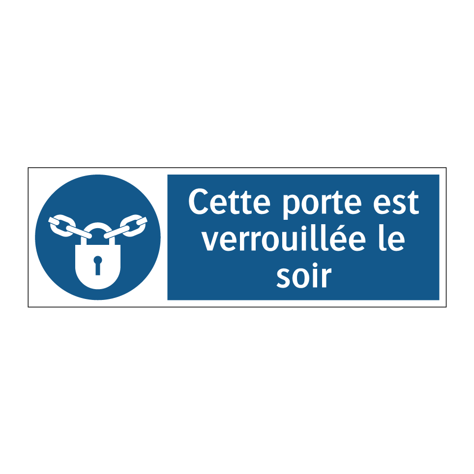 Panneau d'obligation avec le texte : "Cette porte est verrouillée le soir"