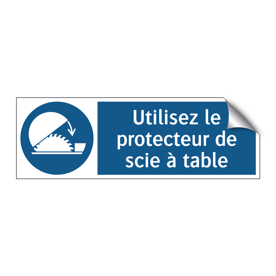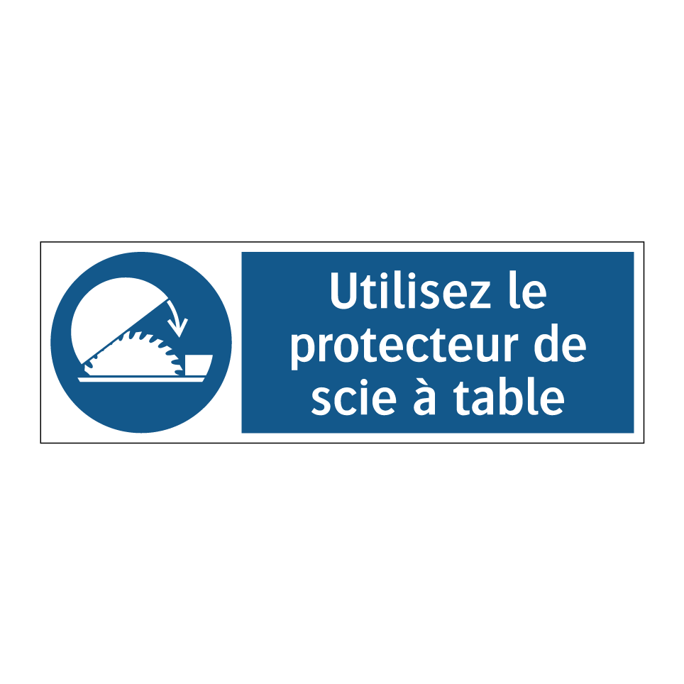 Ce panneau d'obligation est essentiel pour garantir la sécurité dans les environnements de travail où des scies à table sont utilisées. Conçu pour être bien visible grâce à son fond bleu et son texte blanc, il rappelle aux opérateurs l'importance de toujours utiliser le protecteur de scie. Ce type de panneau peut être installé dans des ateliers de menuiserie, des usines de fabrication ou tout autre lieu où des équipements de coupe sont présents. En plaçant ce panneau à proximité des machines, vous assurez une sensibilisation constante et renforcez les pratiques de sécurité. C'est un outil indispensable pour prévenir les accidents et promouvoir un environnement de travail sûr.
