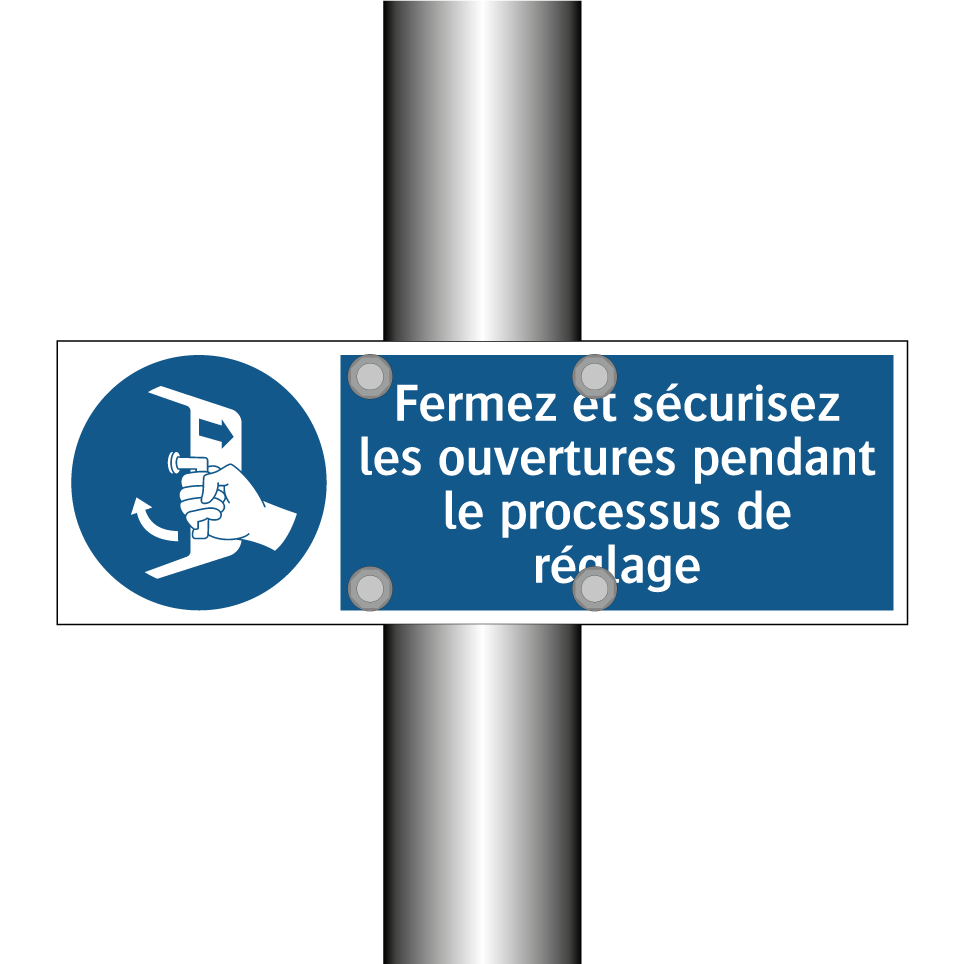 Panneau d'obligation avec le texte : "Fermez et sécurisez les ouvertures pendant le processus de réglage"