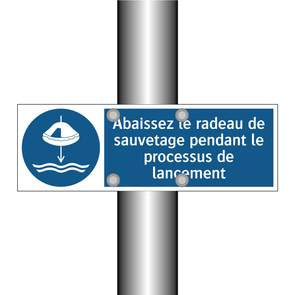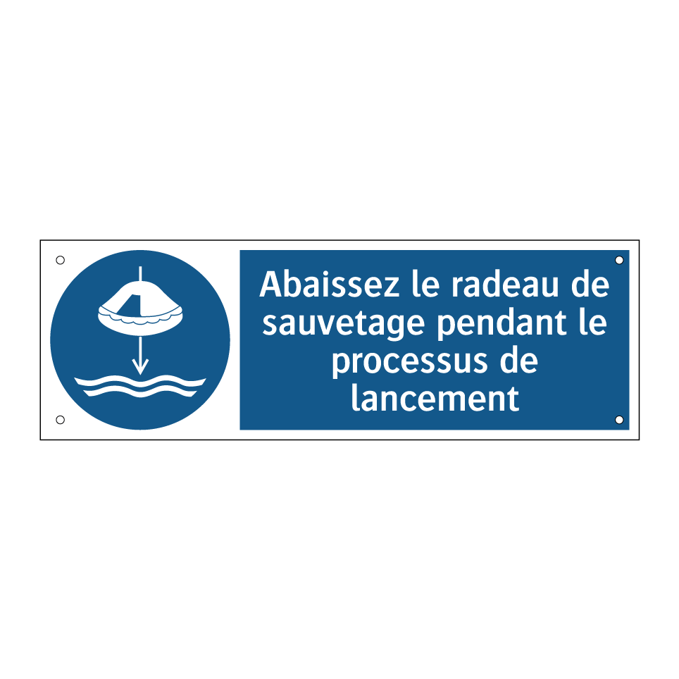 Panneau d'obligation avec le texte : "Abaissez le radeau de sauvetage pendant le processus de lancement"