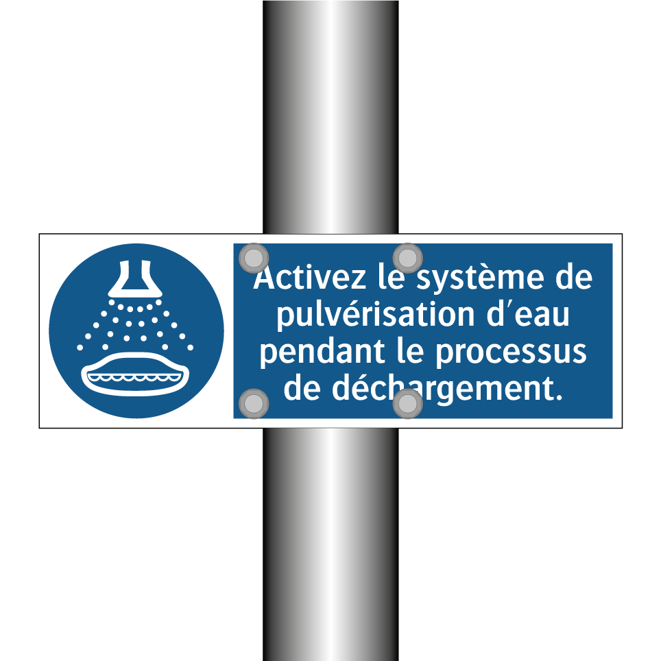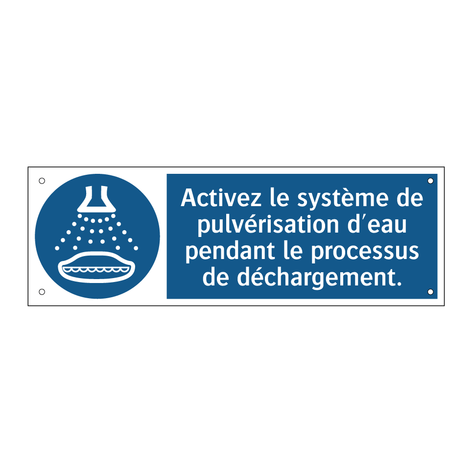 Panneau d'obligation avec le texte : "Activez le système de pulvérisation d'eau pendant le processus de déchargement."