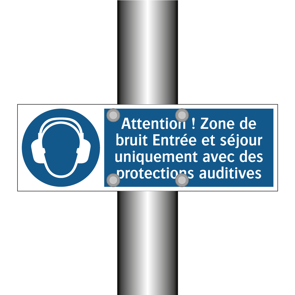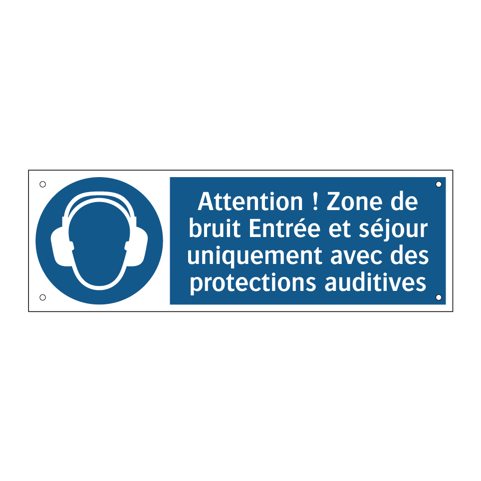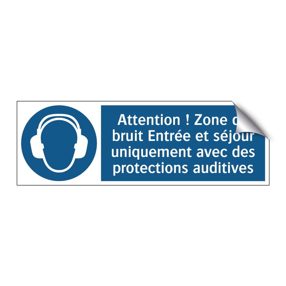 Panneau d'obligation avec le texte : "Attention ! Zone de bruit Entrée et séjour uniquement avec des protections auditives"