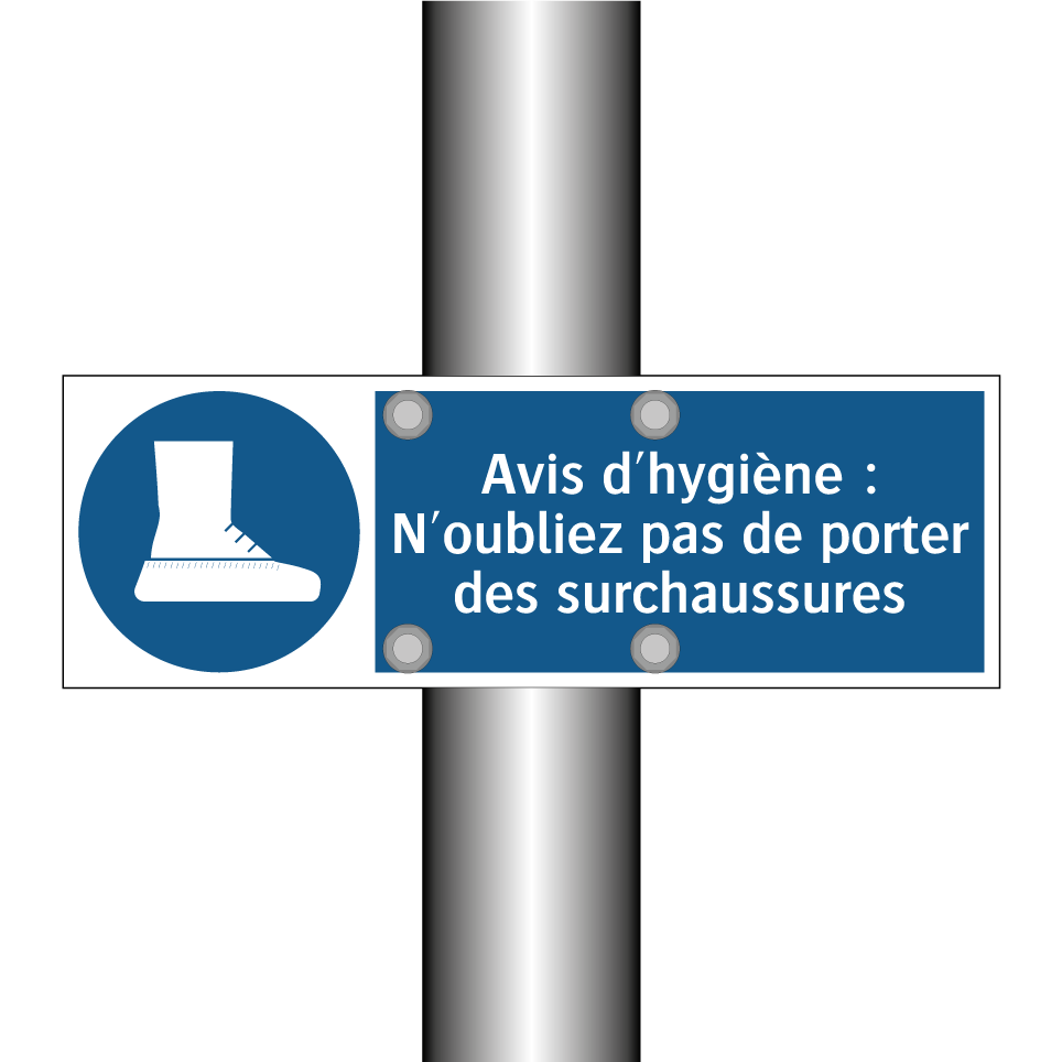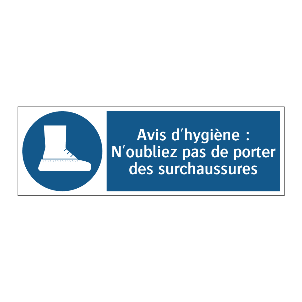 Panneau d'obligation avec le texte : "Avis d'hygiène : N'oubliez pas de porter des surchaussures"