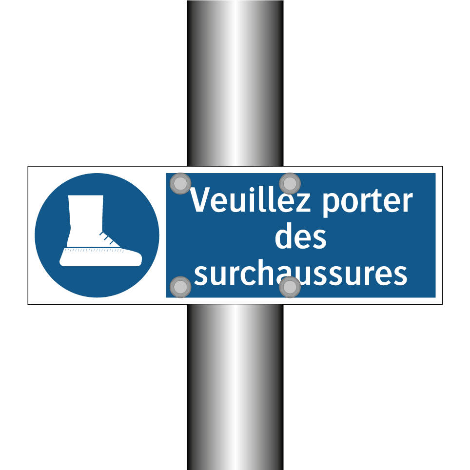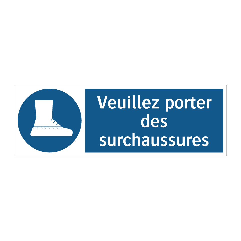 Panneau d'obligation avec le texte : "Veuillez porter des surchaussures"