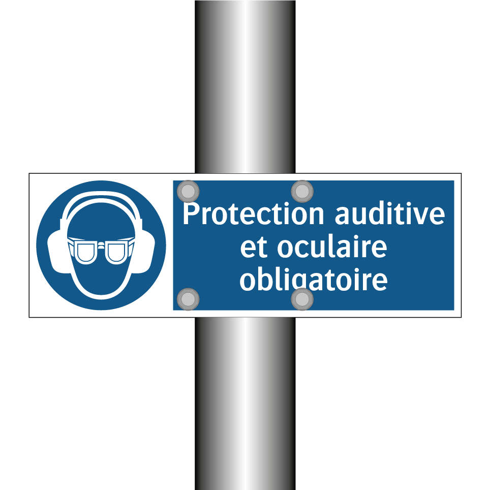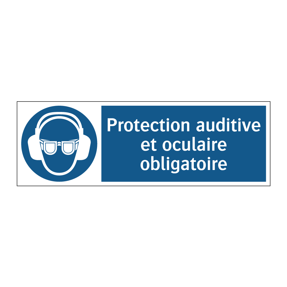 Panneau d'obligation avec le texte : "Protection auditive et oculaire obligatoire"
