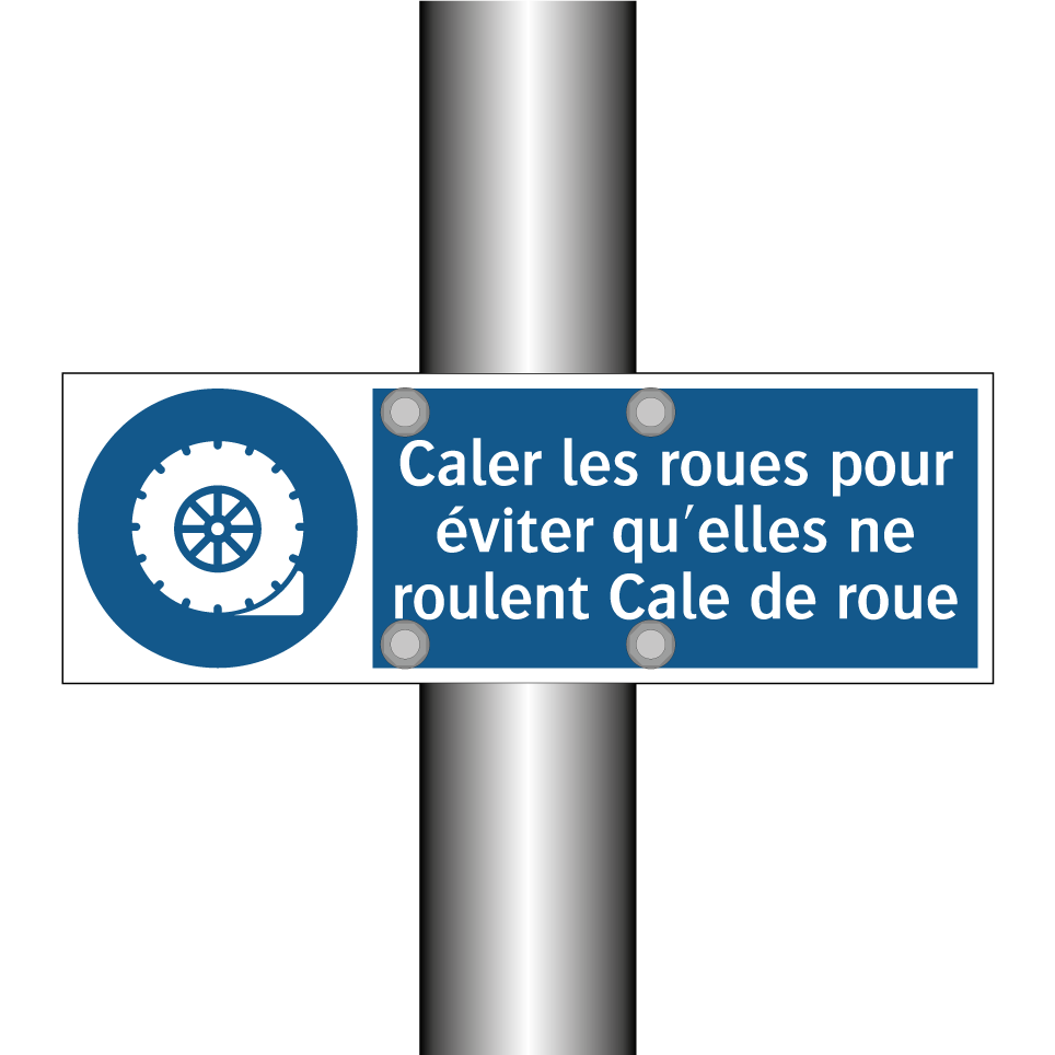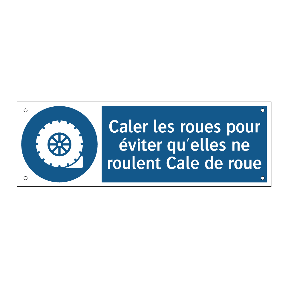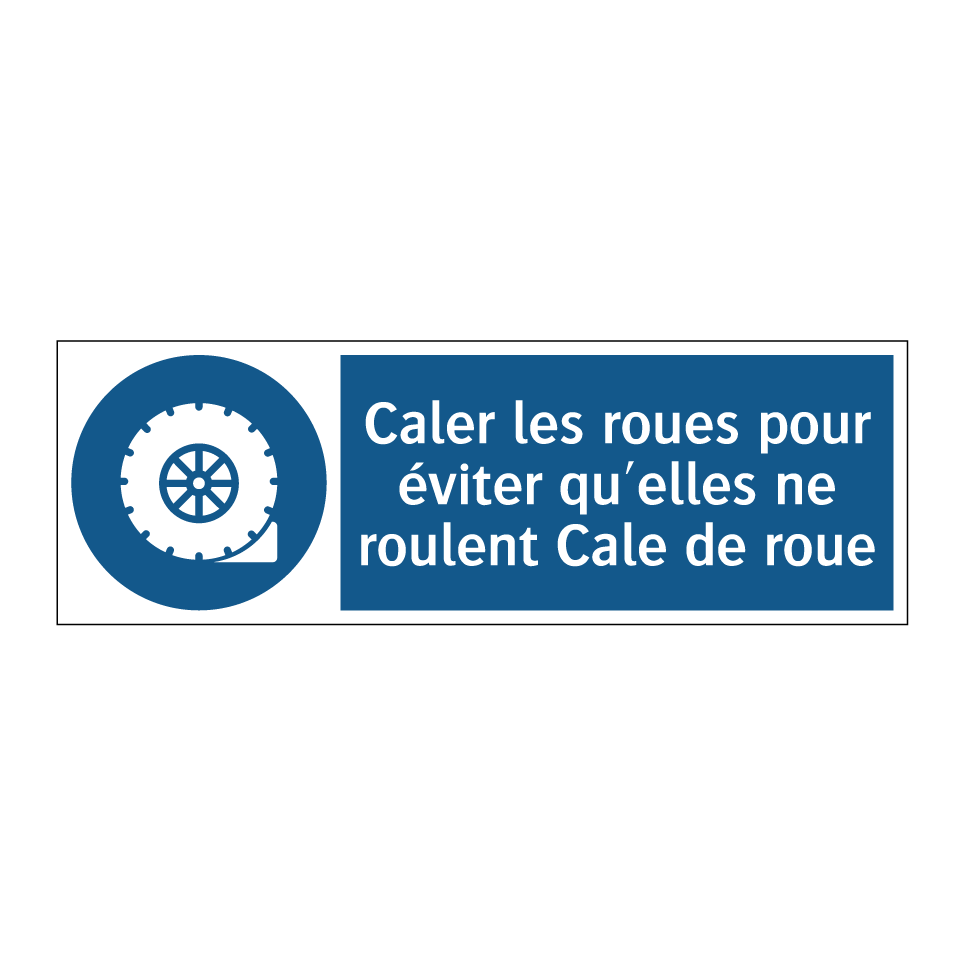 Panneau d'obligation avec le texte : "Caler les roues pour éviter qu'elles ne roulent Cale de roue"