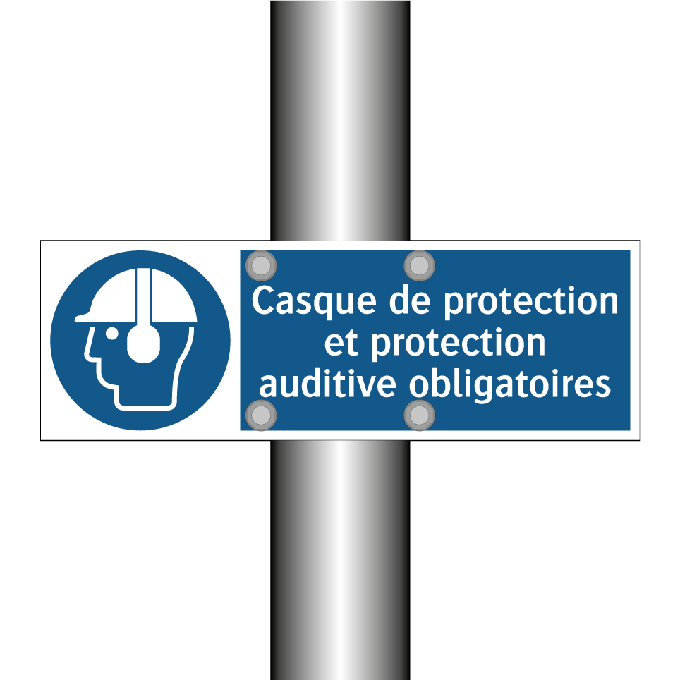 Panneau d'obligation avec le texte : "Casque de protection et protection auditive obligatoires"