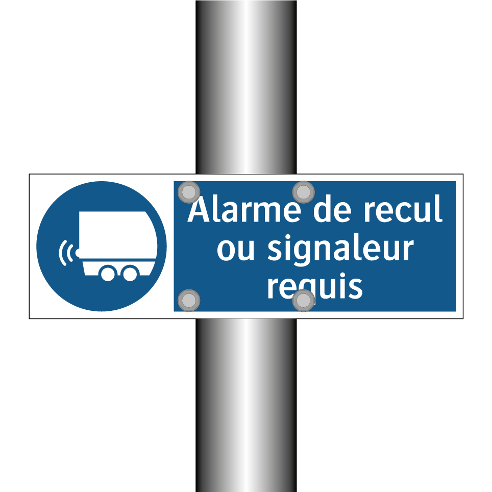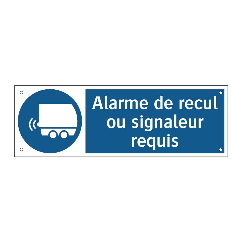 Panneau d'obligation avec le texte : "Alarme de recul ou signaleur requis"