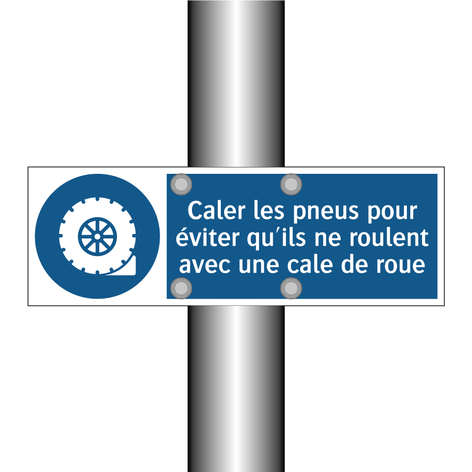 Panneau d'obligation avec le texte : "Caler les pneus pour éviter qu'ils ne roulent avec une cale de roue"