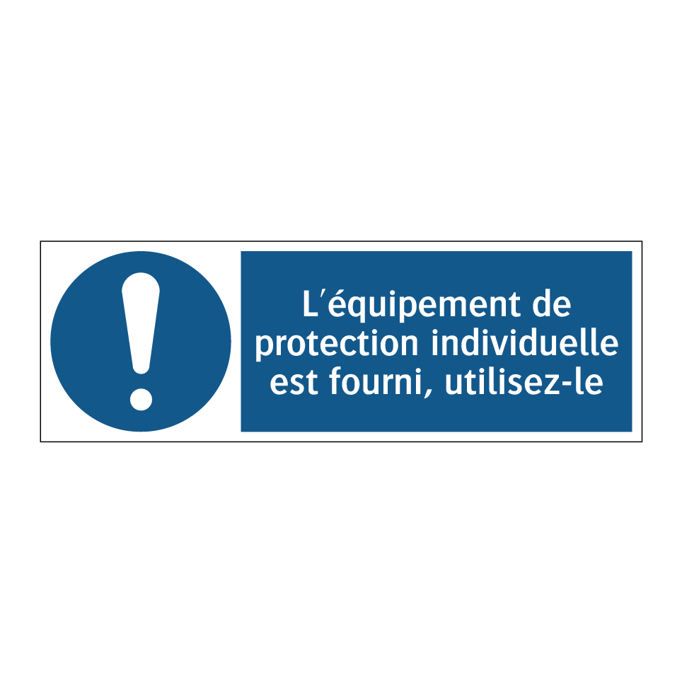Panneau d'obligation avec le texte : "L'équipement de protection individuelle est fourni, utilisez-le"