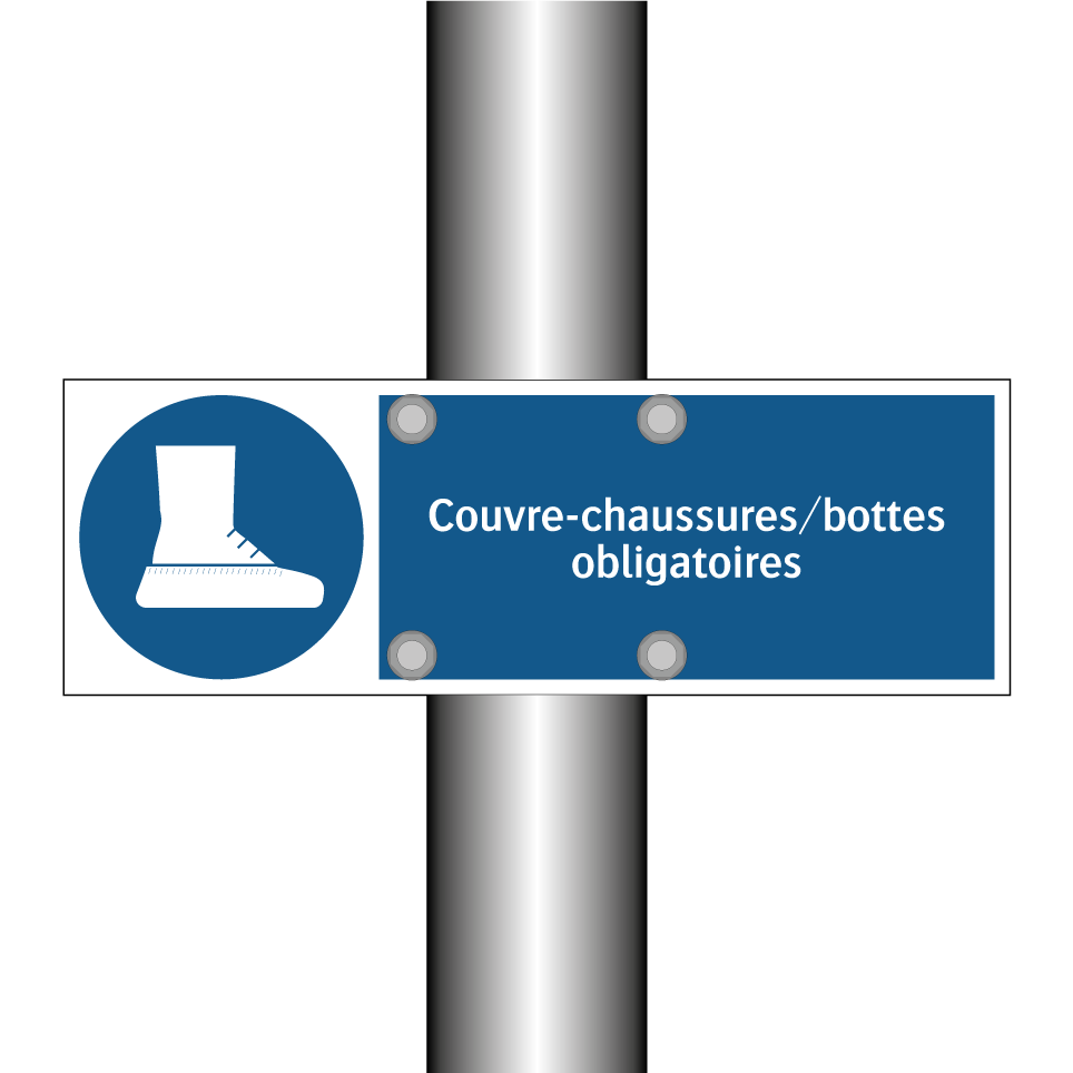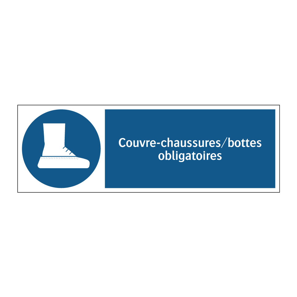 Panneau d'obligation avec le texte : "Couvre-chaussures/bottes obligatoires"