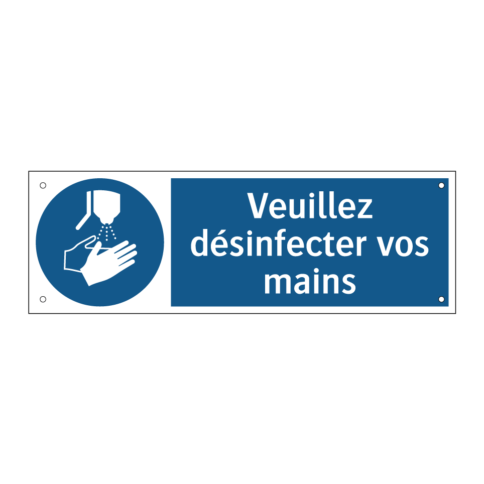 Ce panneau d'obligation est essentiel pour garantir l'hygiène dans les espaces publics. Il invite les visiteurs à se désinfecter les mains, contribuant ainsi à maintenir un environnement sain et sécurisé. Idéal pour les entrées de bâtiments, les halls d'accueil, les bureaux, les écoles et les centres commerciaux, ce panneau assure que les mesures sanitaires sont respectées. Sa couleur bleue et son texte blanc attirent l'attention, tandis que la symbolique claire renforce le message. En plaçant ce panneau à des endroits stratégiques, vous encouragez une pratique d'hygiène essentielle et montrez votre engagement envers la santé publique.