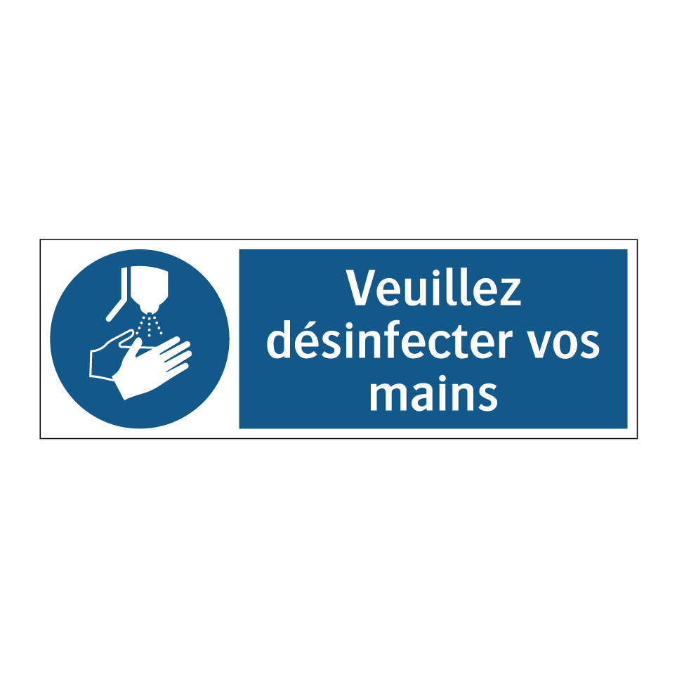 Panneau d'obligation avec le texte : "Veuillez désinfecter vos mains"