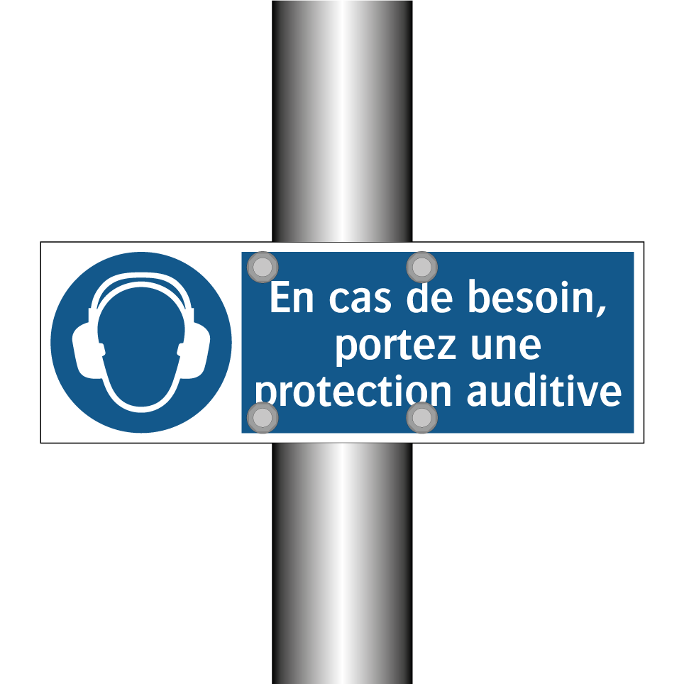 Panneau d'obligation avec le texte : "En cas de besoin, portez une protection auditive"