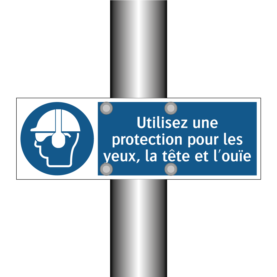 Panneau d'obligation avec le texte : "Utilisez une protection pour les yeux, la tête et l'ouïe"