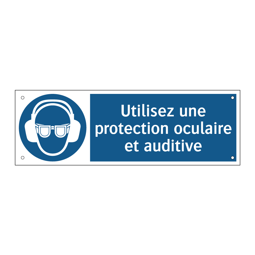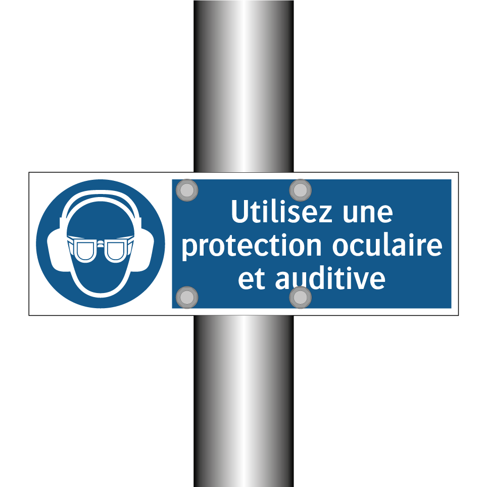 Panneau d'obligation avec le texte : "Utilisez une protection oculaire et auditive"