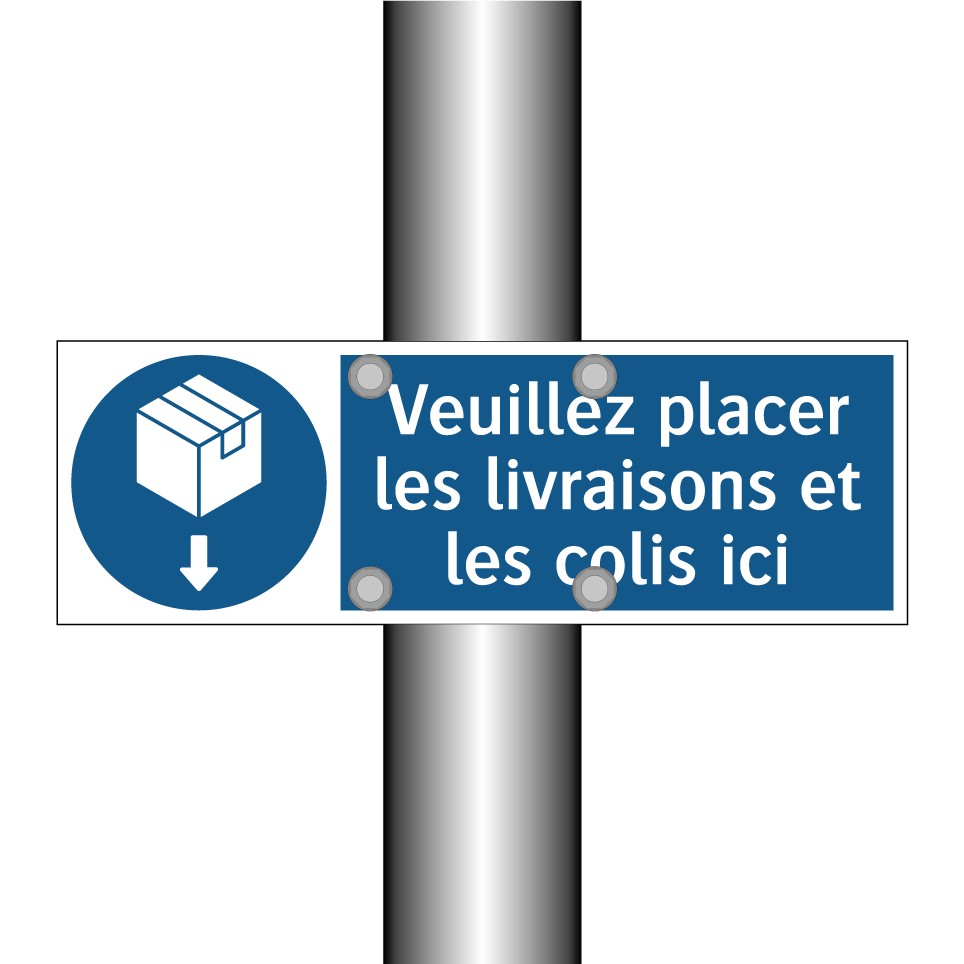 Panneau d'obligation avec le texte : "Veuillez placer les livraisons et les colis ici"