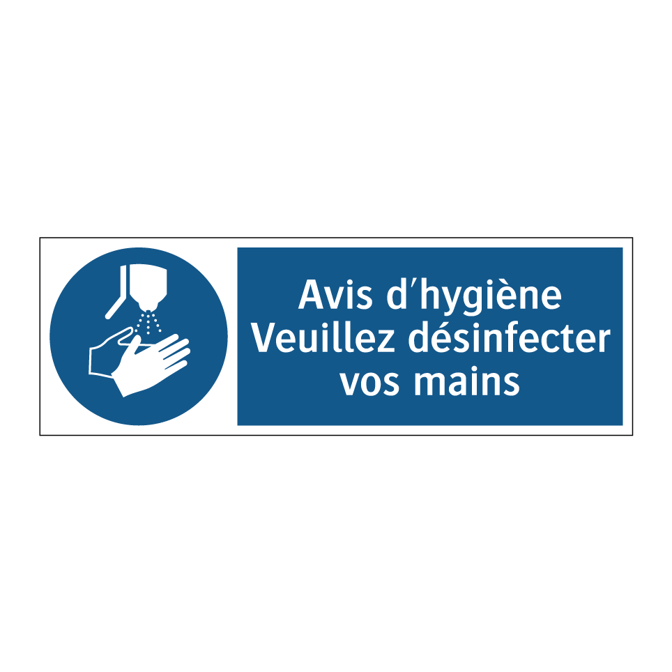 Panneau d'obligation avec le texte : "Avis d'hygiène Veuillez désinfecter vos mains"