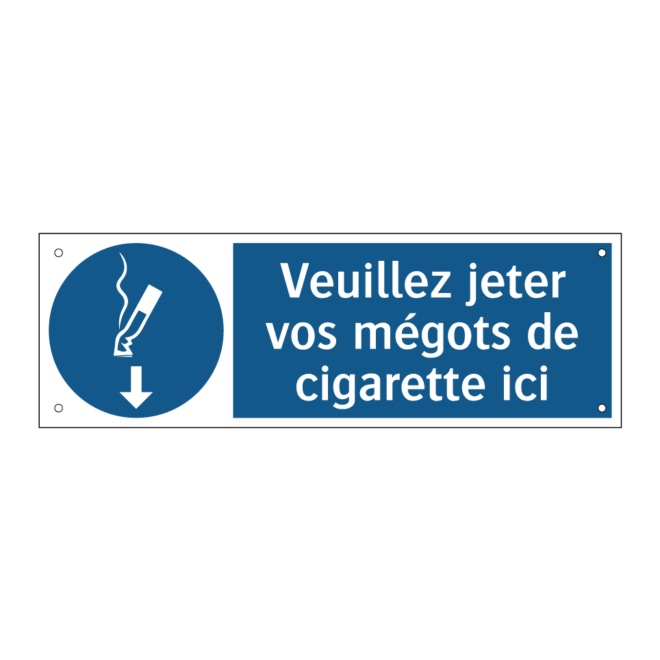 Panneau d'obligation avec le texte : "Veuillez jeter vos mégots de cigarette ici"