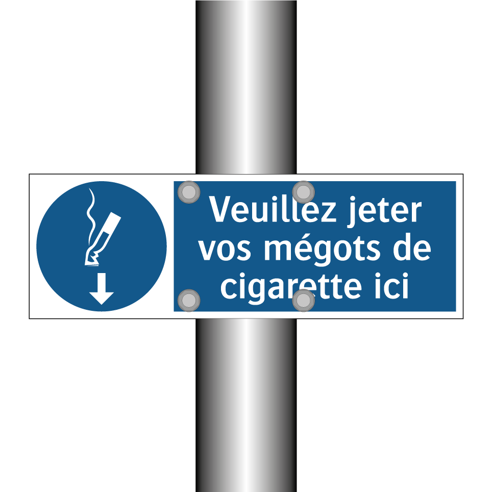 Ce panneau d'obligation est essentiel pour maintenir la propreté et l'ordre dans les espaces publics. Conçu pour encourager les fumeurs à disposer de leurs mégots de manière responsable, il trouve sa place idéale à l'entrée des bâtiments, dans les zones fumeurs désignées, ou à proximité des poubelles extérieures. Grâce à sa couleur bleue et son texte blanc, il attire facilement l'attention et transmet un message clair. Ce type de signalisation est particulièrement utile dans les parcs, les zones commerciales, et les espaces de loisirs, où il contribue à réduire la pollution et à promouvoir un environnement plus propre. En installant ce panneau, vous participez activement à la préservation de la propreté de votre environnement.