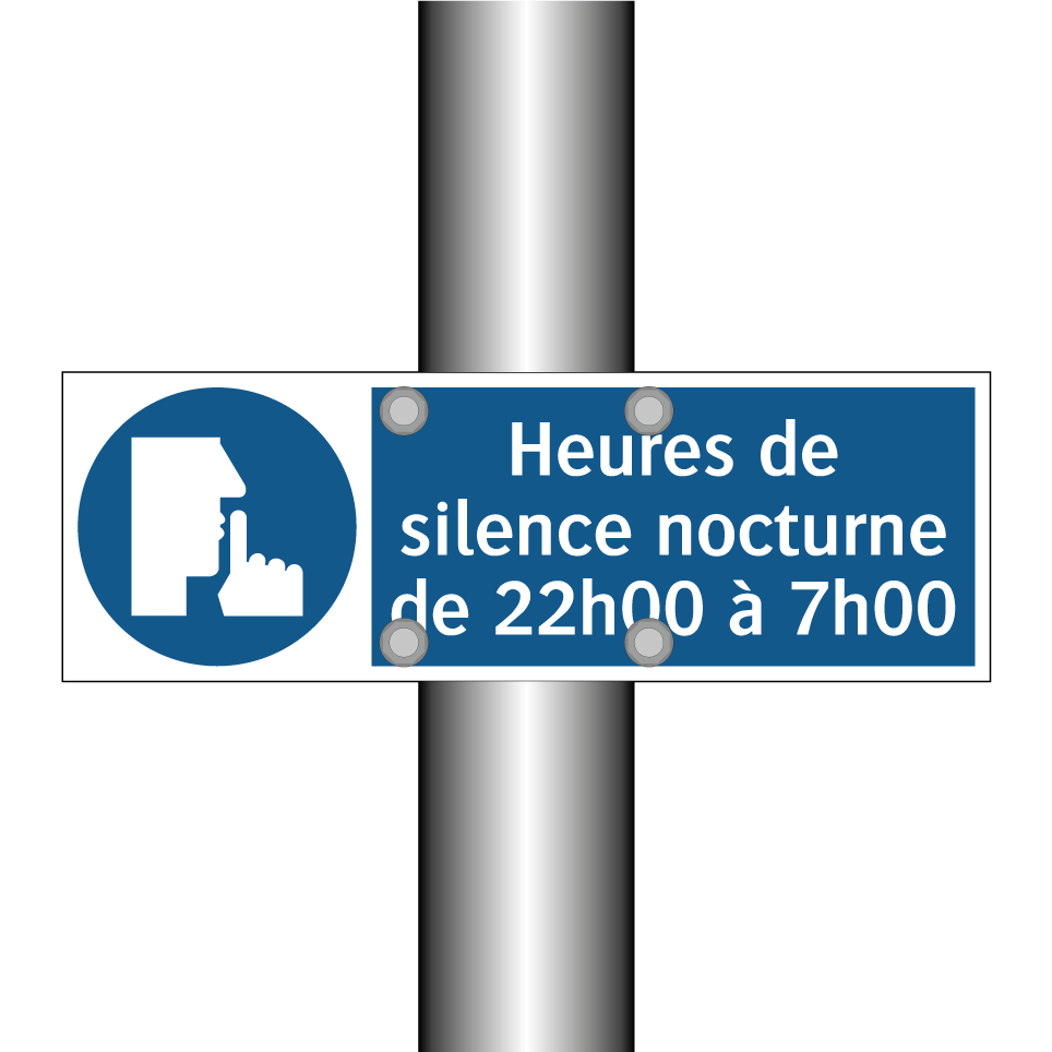 Panneau d'obligation avec le texte : "Heures de silence nocturne de 22h00 à 7h00"