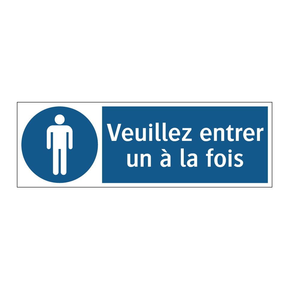Ce panneau d'obligation est essentiel pour assurer un flux ordonné dans les espaces où le passage doit être régulé. Idéal pour les entrées de magasins, bureaux ou tout autre lieu public, il rappelle aux visiteurs de patienter et d'entrer un par un. Grâce à sa couleur bleue et son texte blanc, il est facilement visible et attire l'attention, garantissant ainsi le respect des consignes. Ce type de signalisation est particulièrement utile dans les zones à forte affluence, où la gestion du flux de personnes est cruciale pour la sécurité et le confort de tous. En installant ce panneau, vous contribuez à maintenir un environnement organisé et sécurisé.