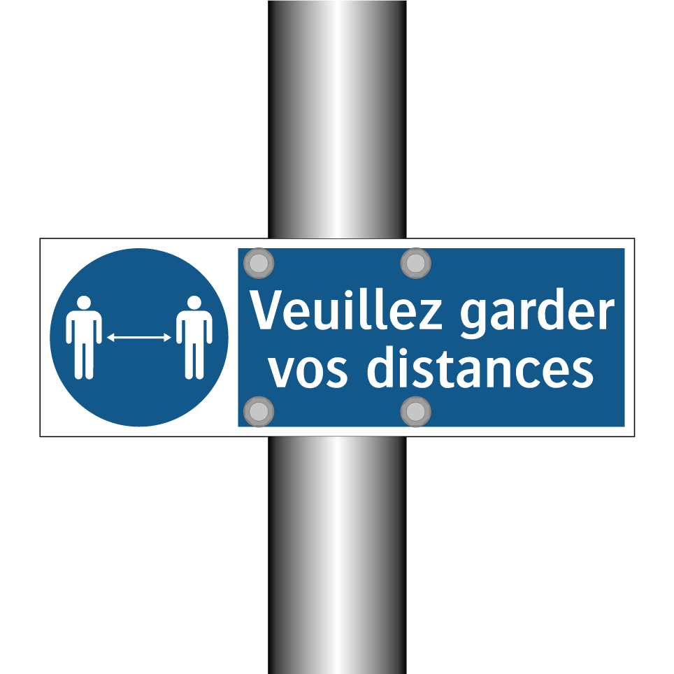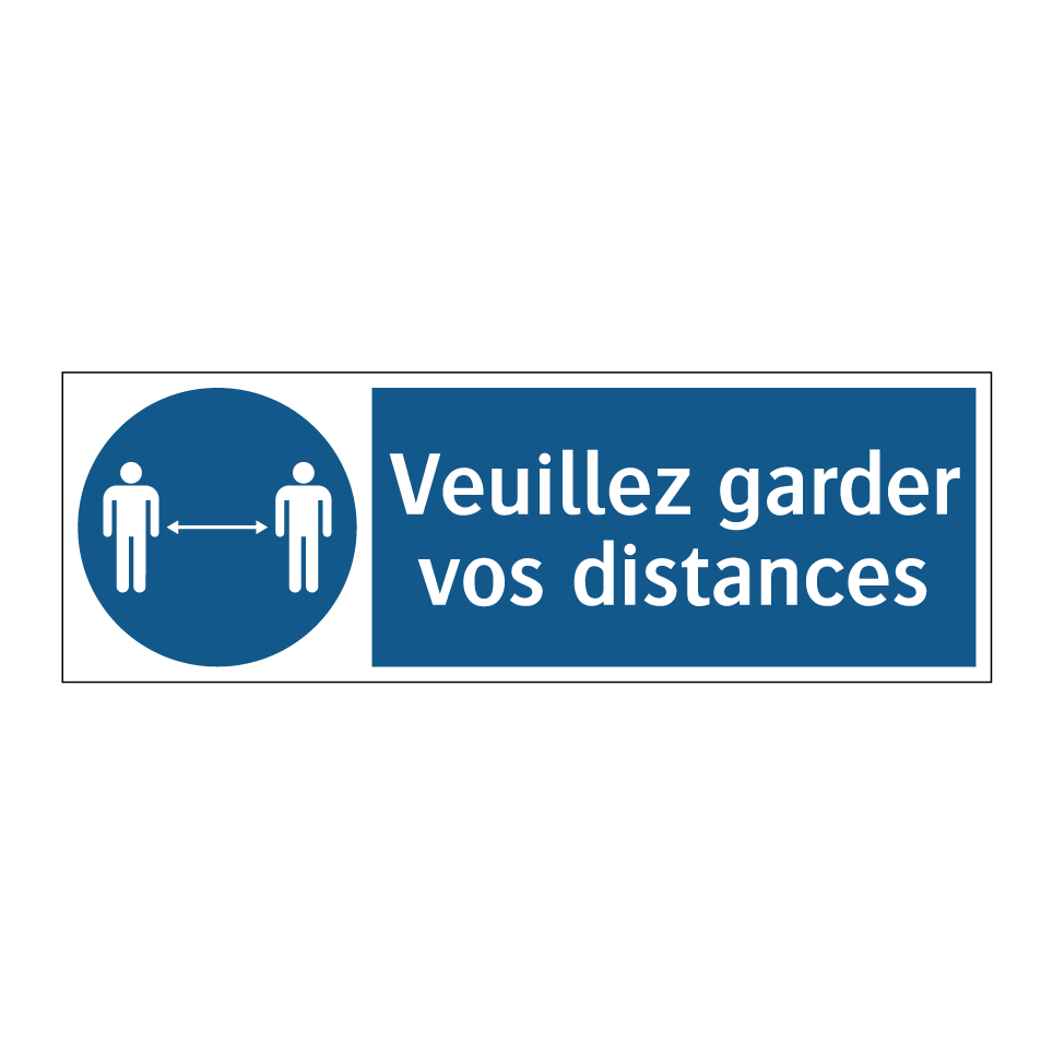 Panneau d'obligation avec le texte : "Veuillez garder vos distances"