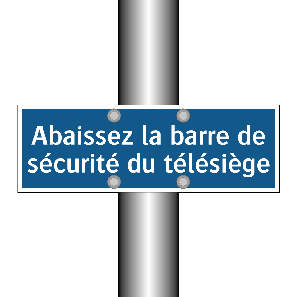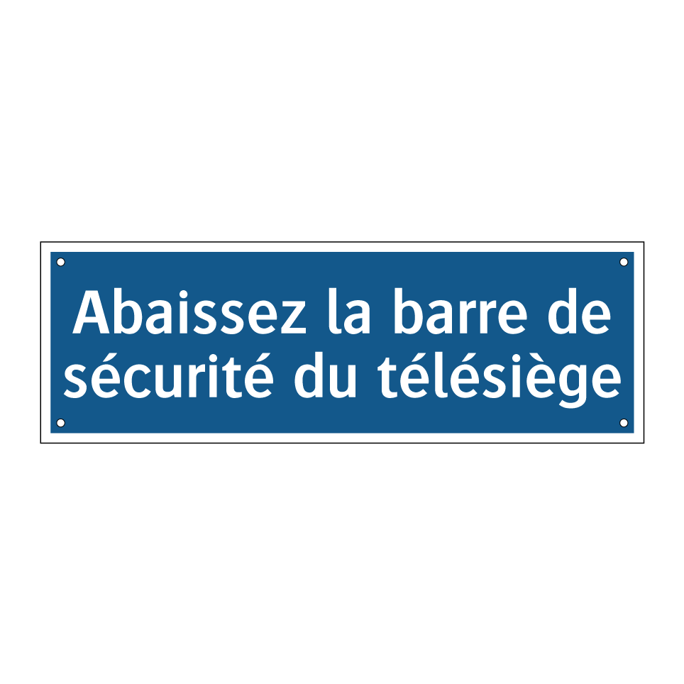 Panneau d'obligation avec le texte : "Abaissez la barre de sécurité du télésiège"