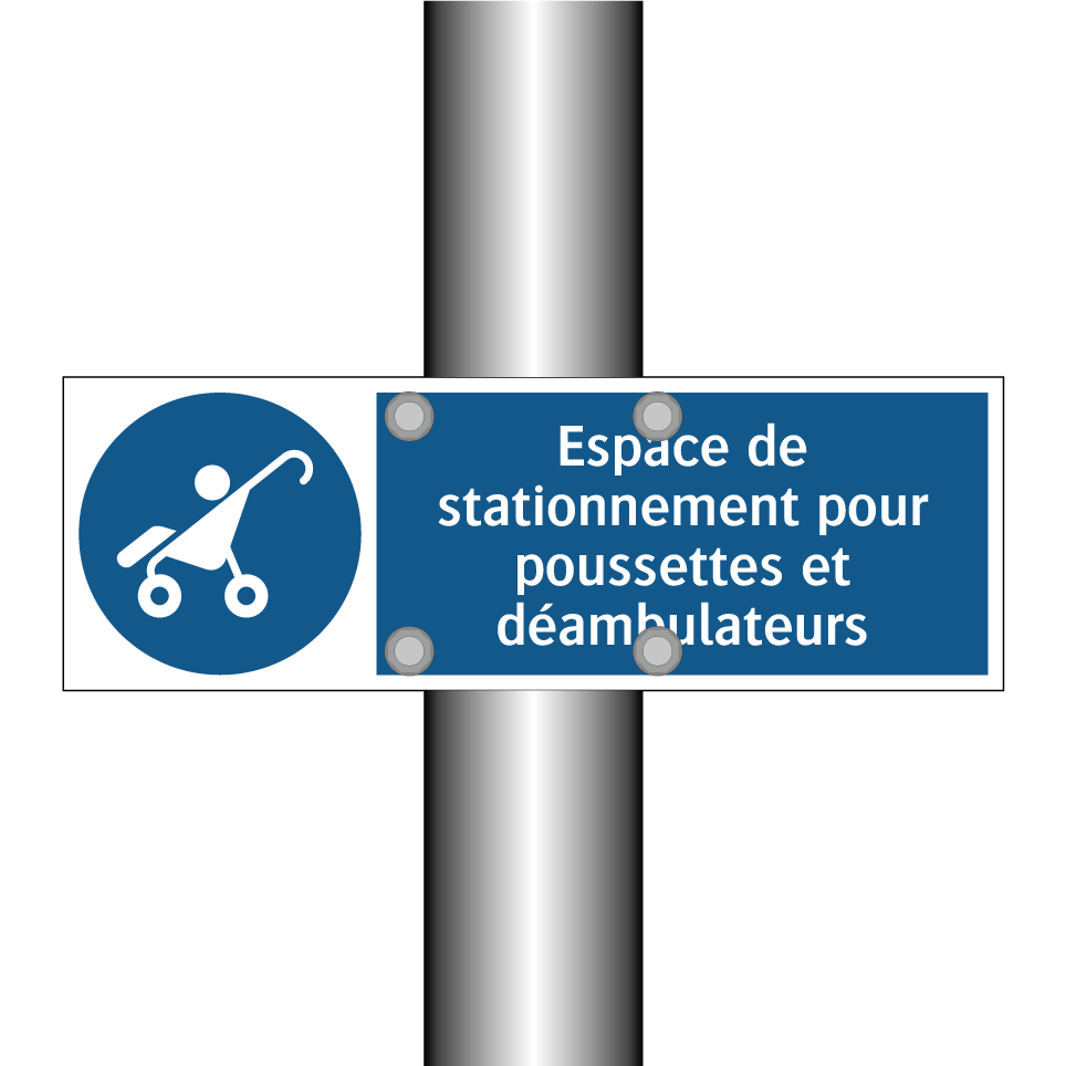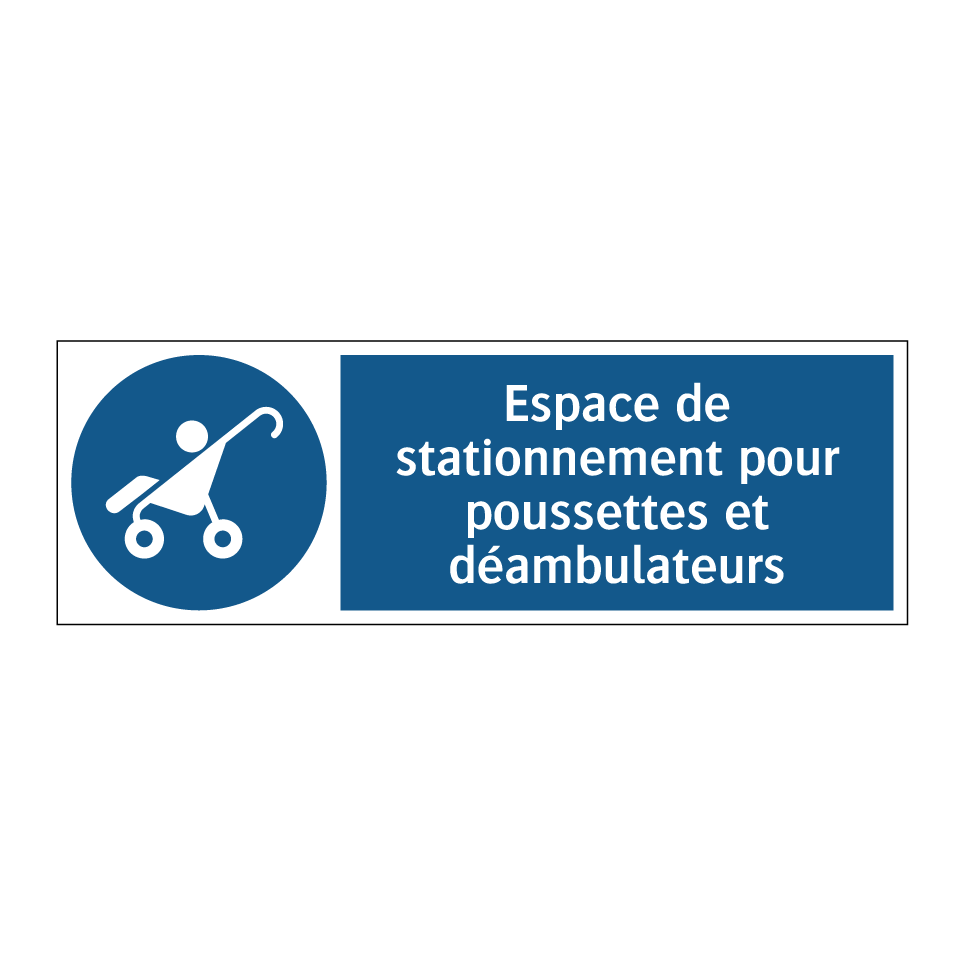 Panneau d'obligation avec le texte : "Espace de stationnement pour poussettes et déambulateurs"