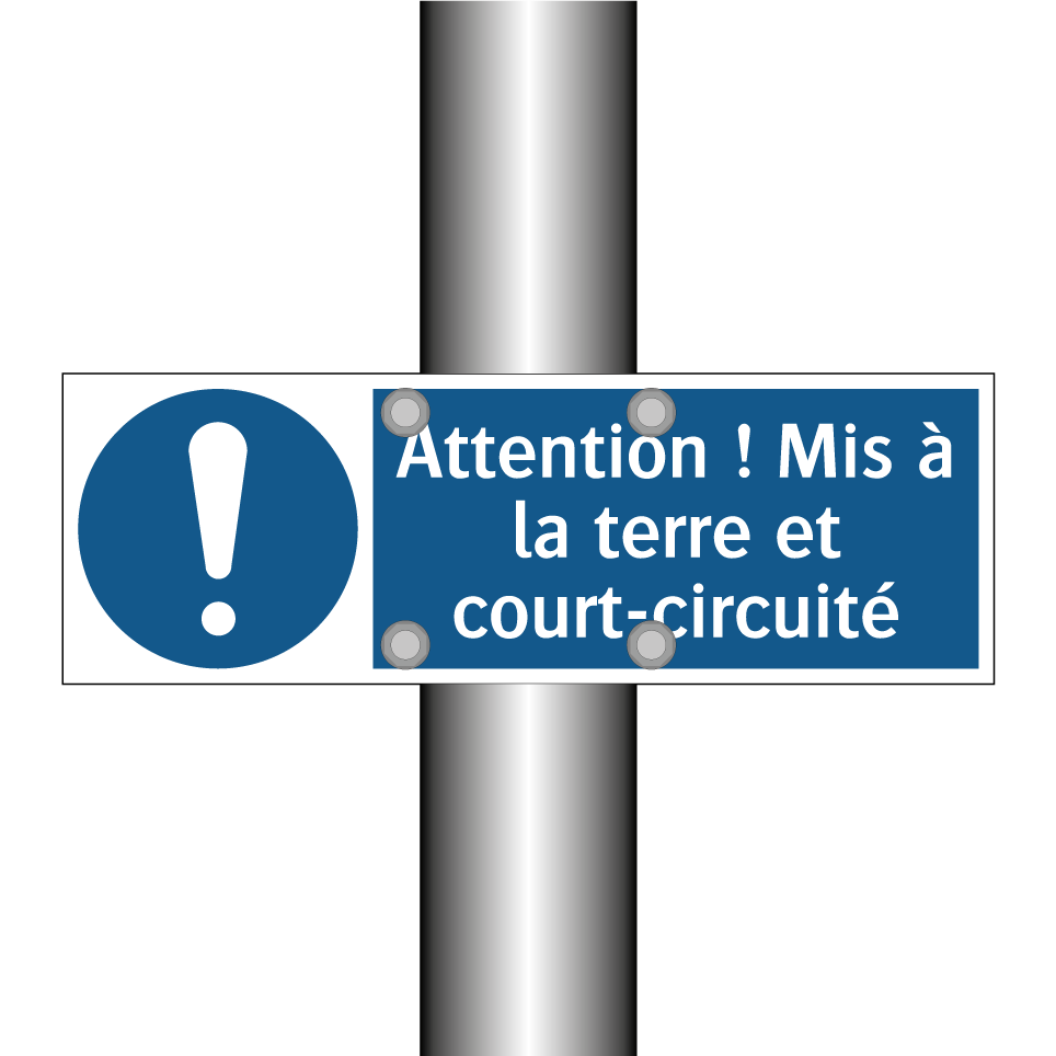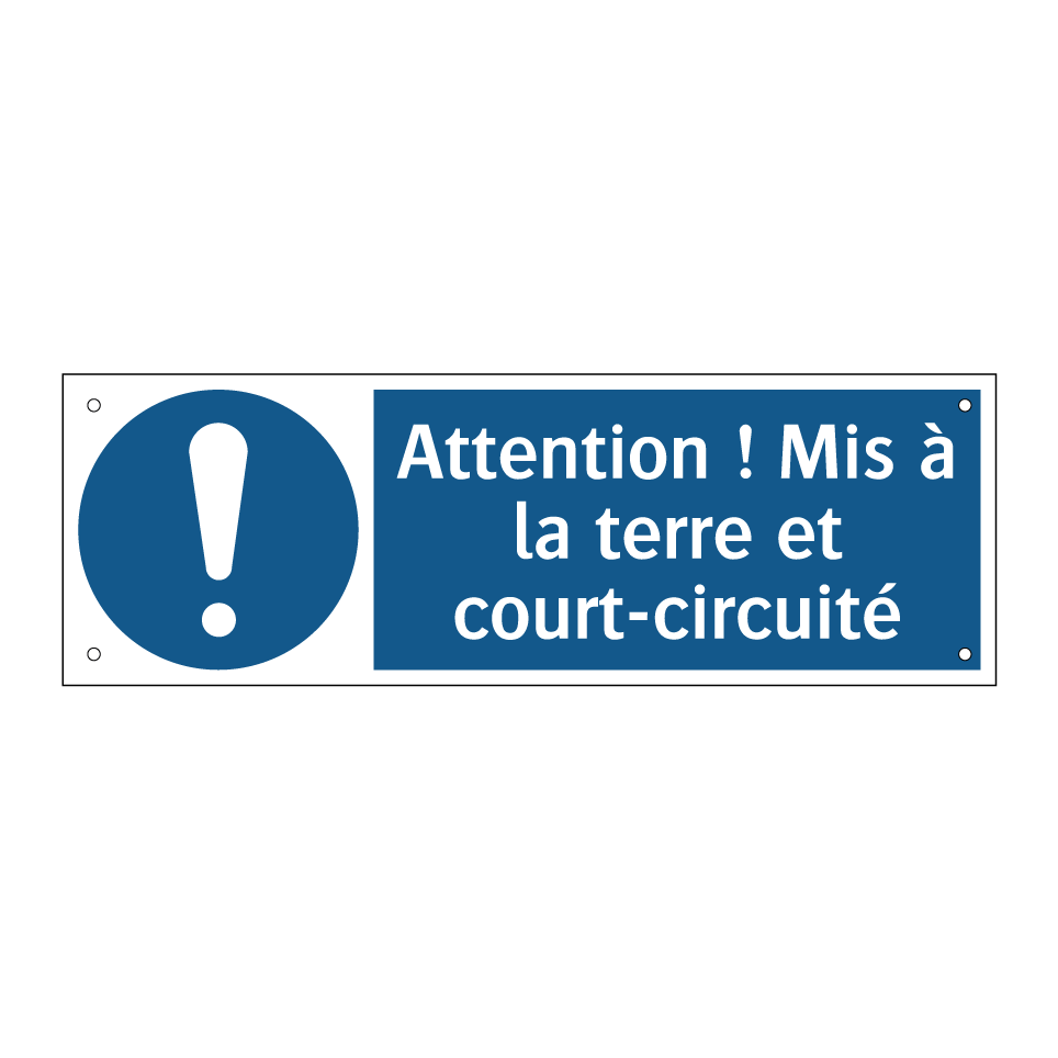 Panneau d'obligation avec le texte : "Attention ! Mis à la terre et court-circuité"
