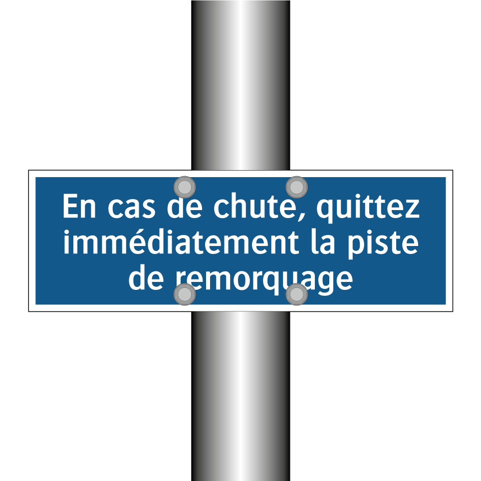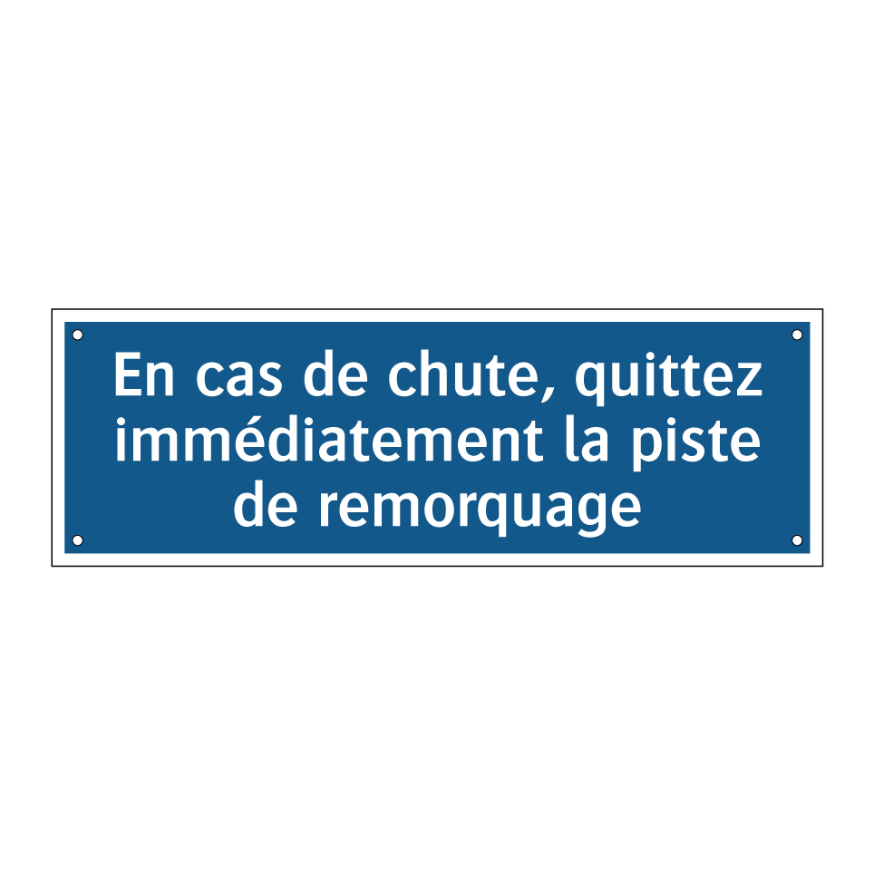 Panneau d'obligation avec le texte : "En cas de chute, quittez immédiatement la piste de remorquage"